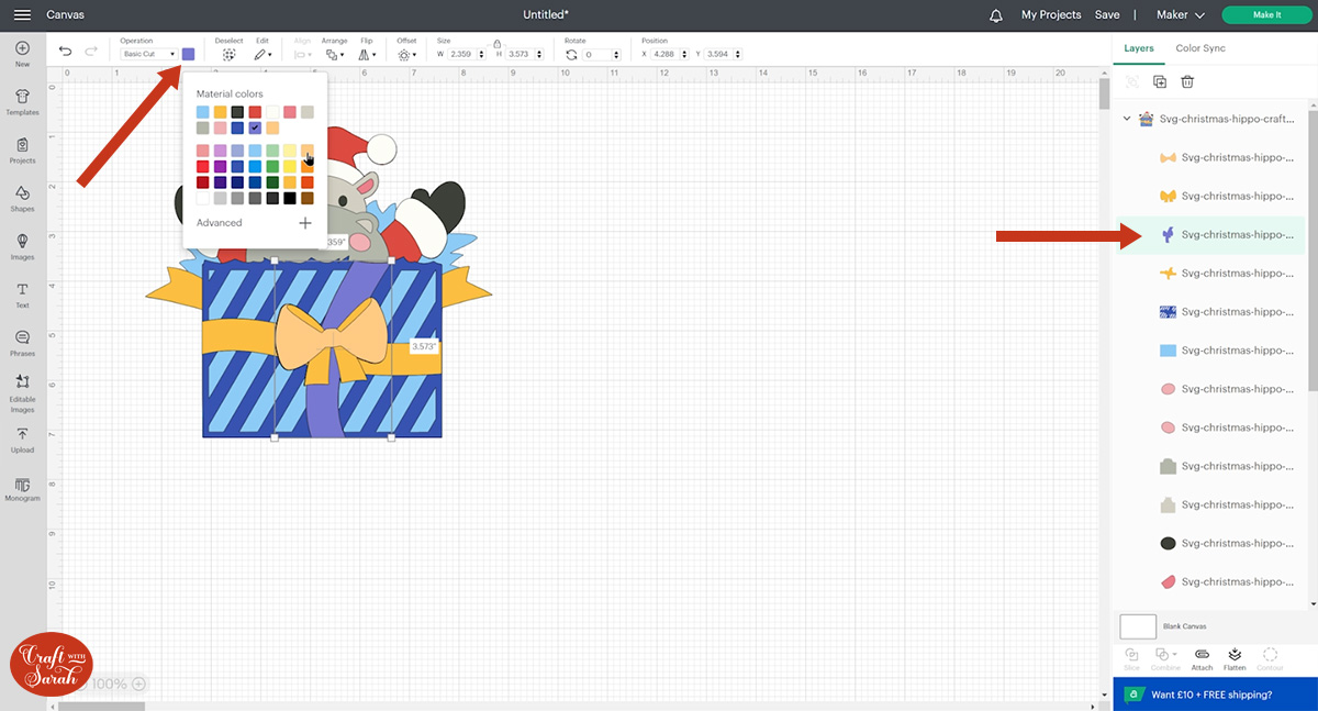 To change the colour of the gift box, click each layer individually in the Layers panel on the right of the screen and then go into the colour box to change it.