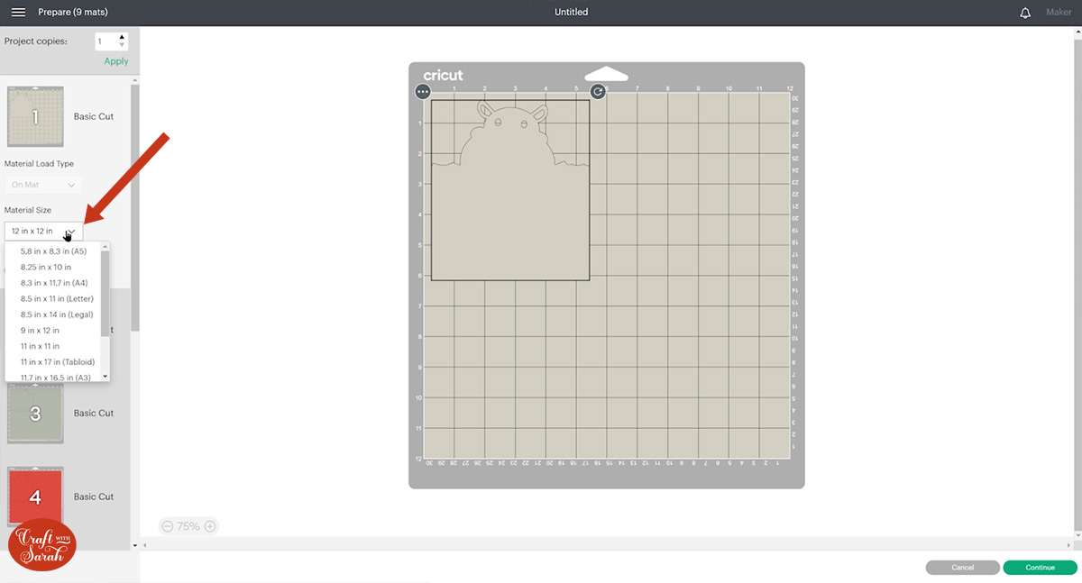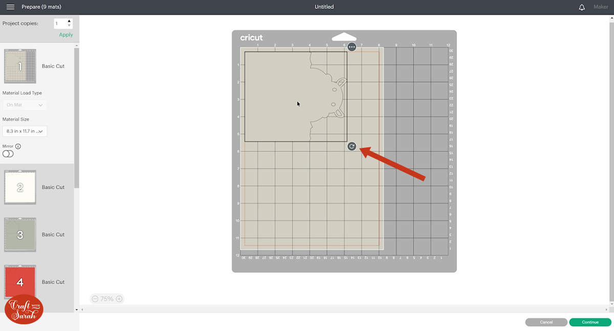 I cut my design at 7.5 inches wide (6.726 tall). I don’t recommend going smaller than about 4 inches in width as some of the cuts will get a little bit too tiny and hard to stick.