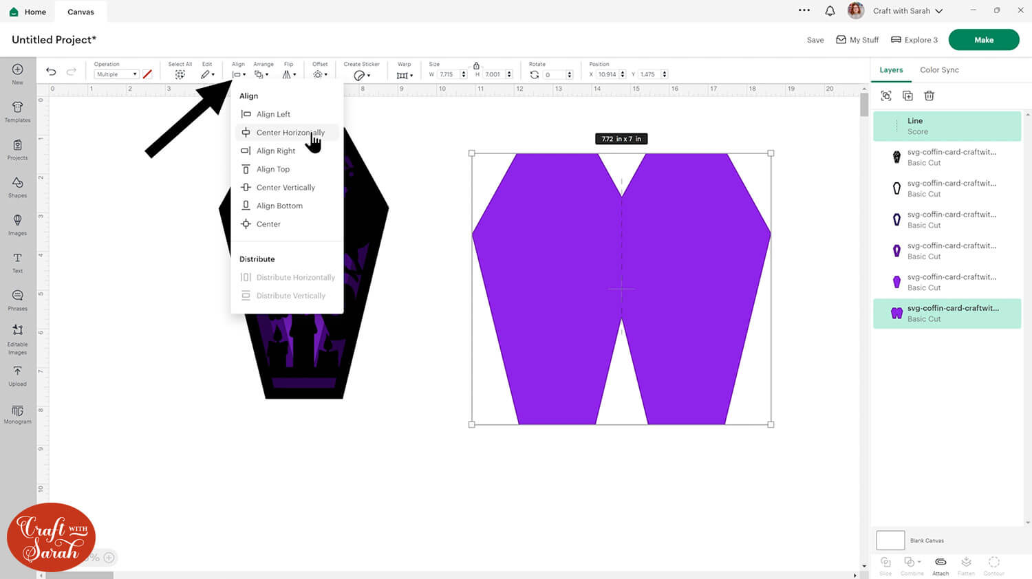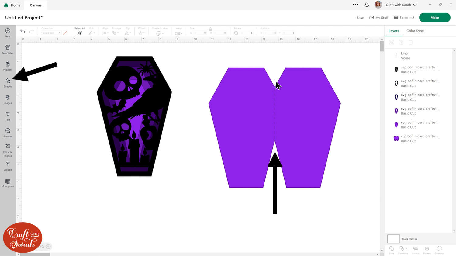 Click “Shapes” and insert a Score Line. Position it roughly in the middle of the coffin base card and drag the score line so that it is just taller than the section where the two coffin shapes join.