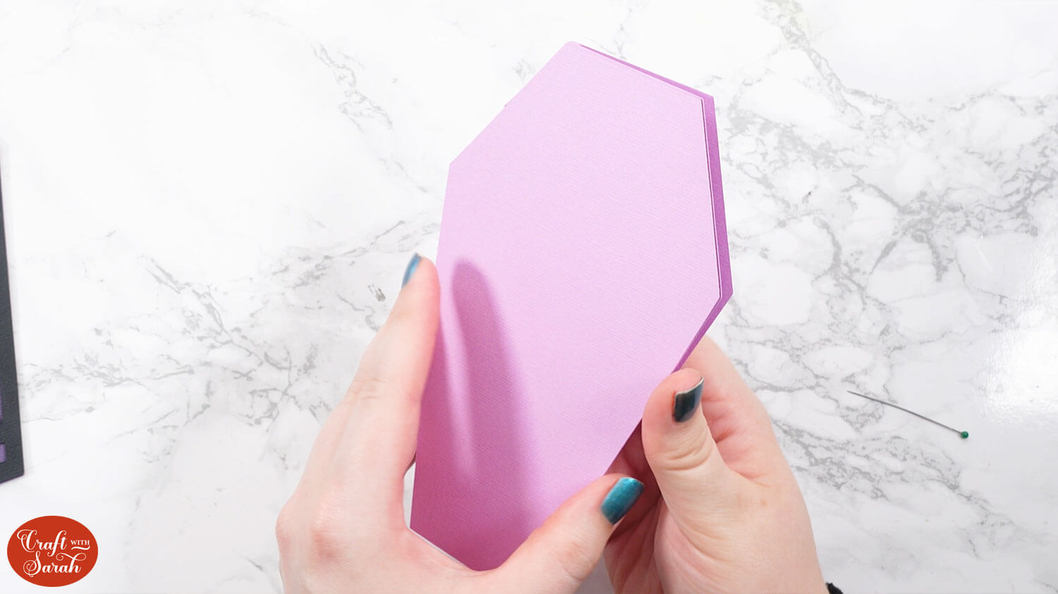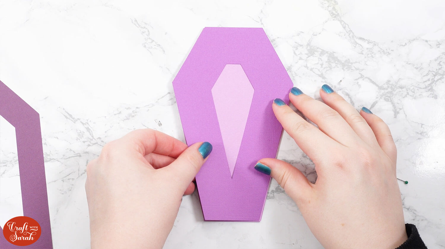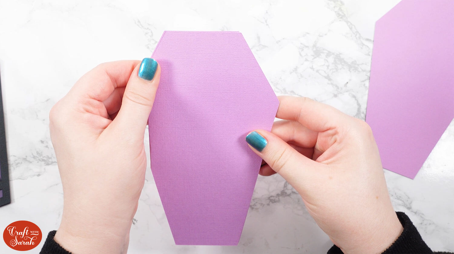 Glue the coffin shape that’s the same colour as the base card on top. This will overlap the base card on the left to complete the shape of the coffin that’s currently not there due to the score line.