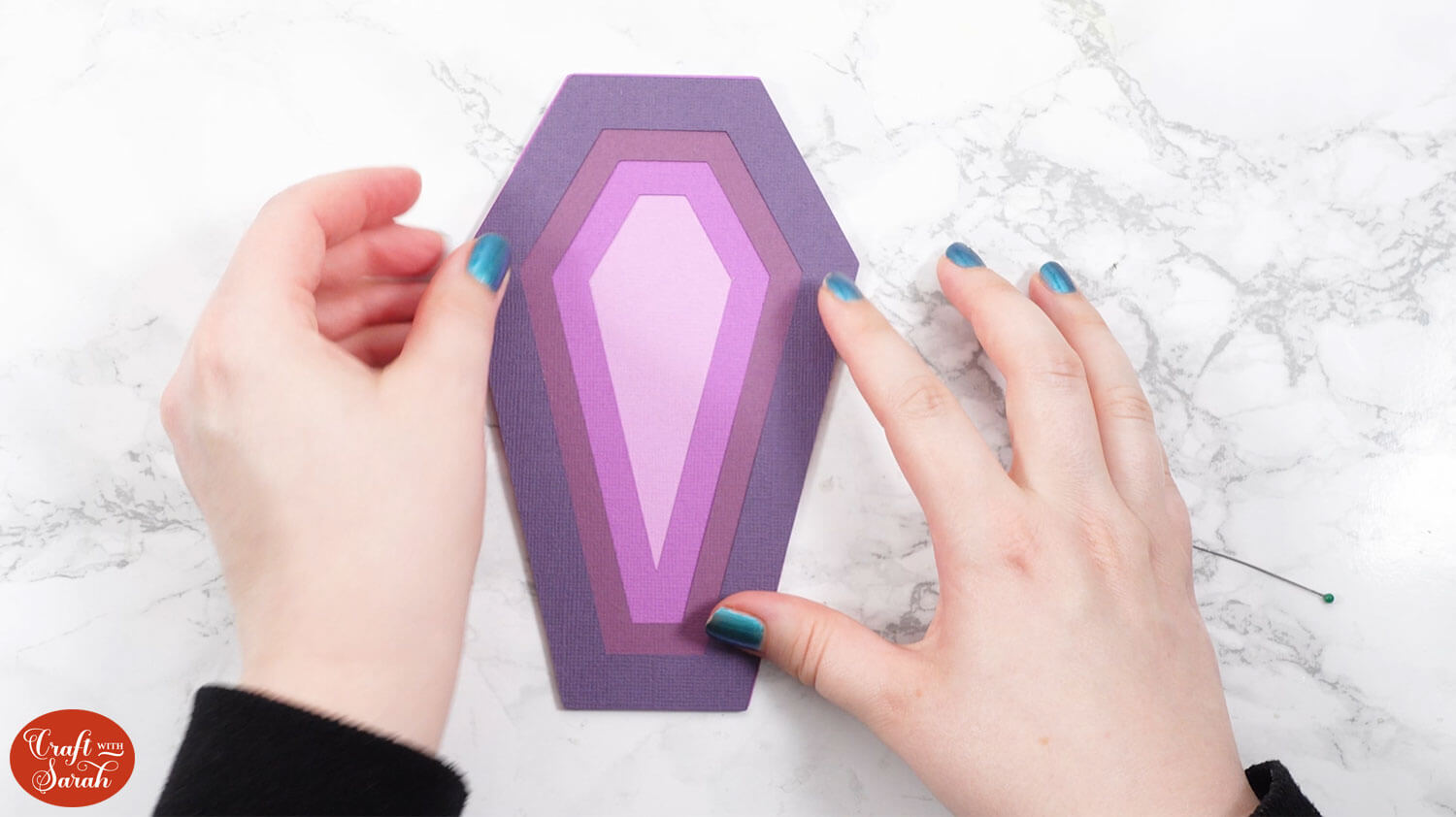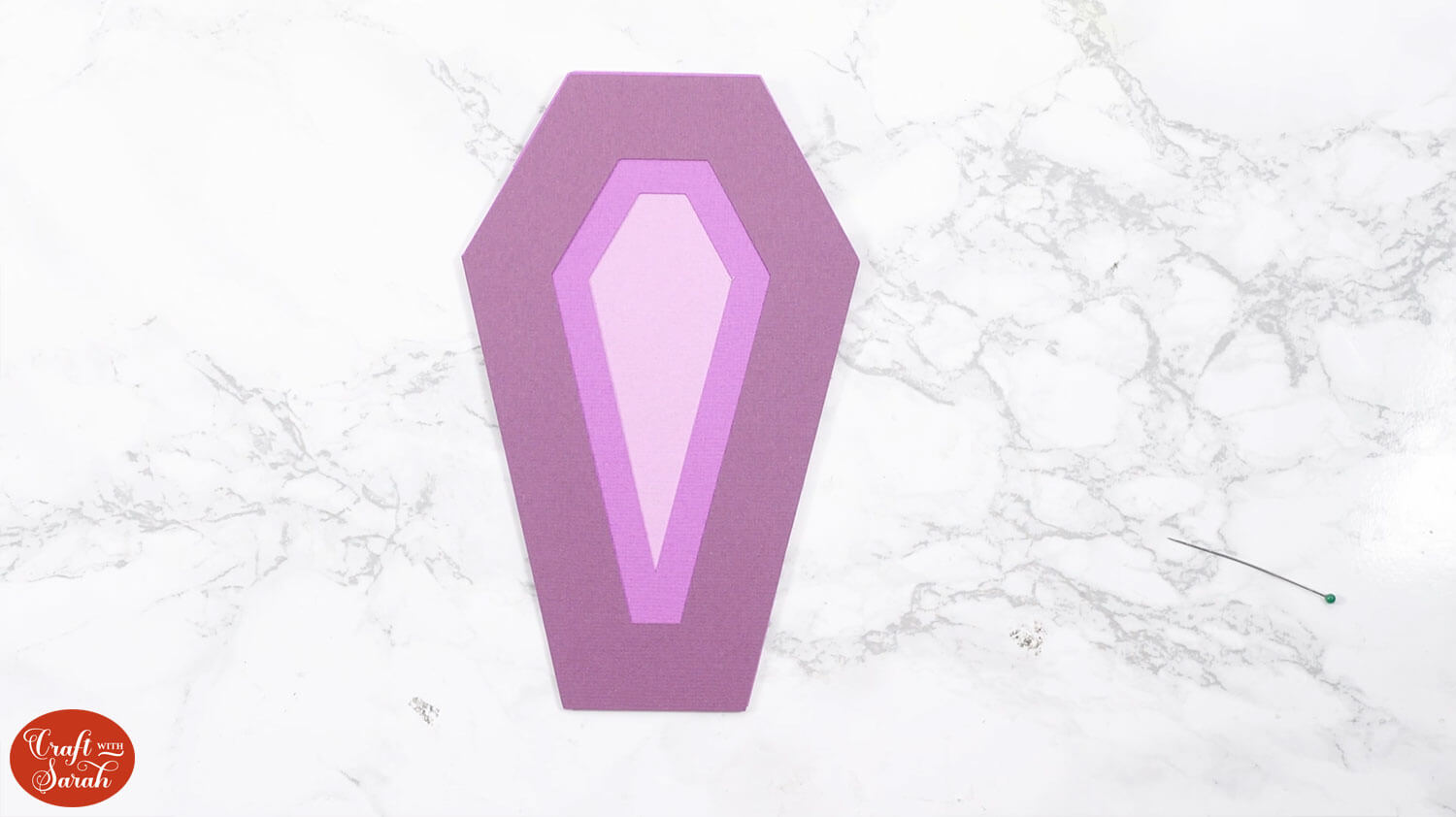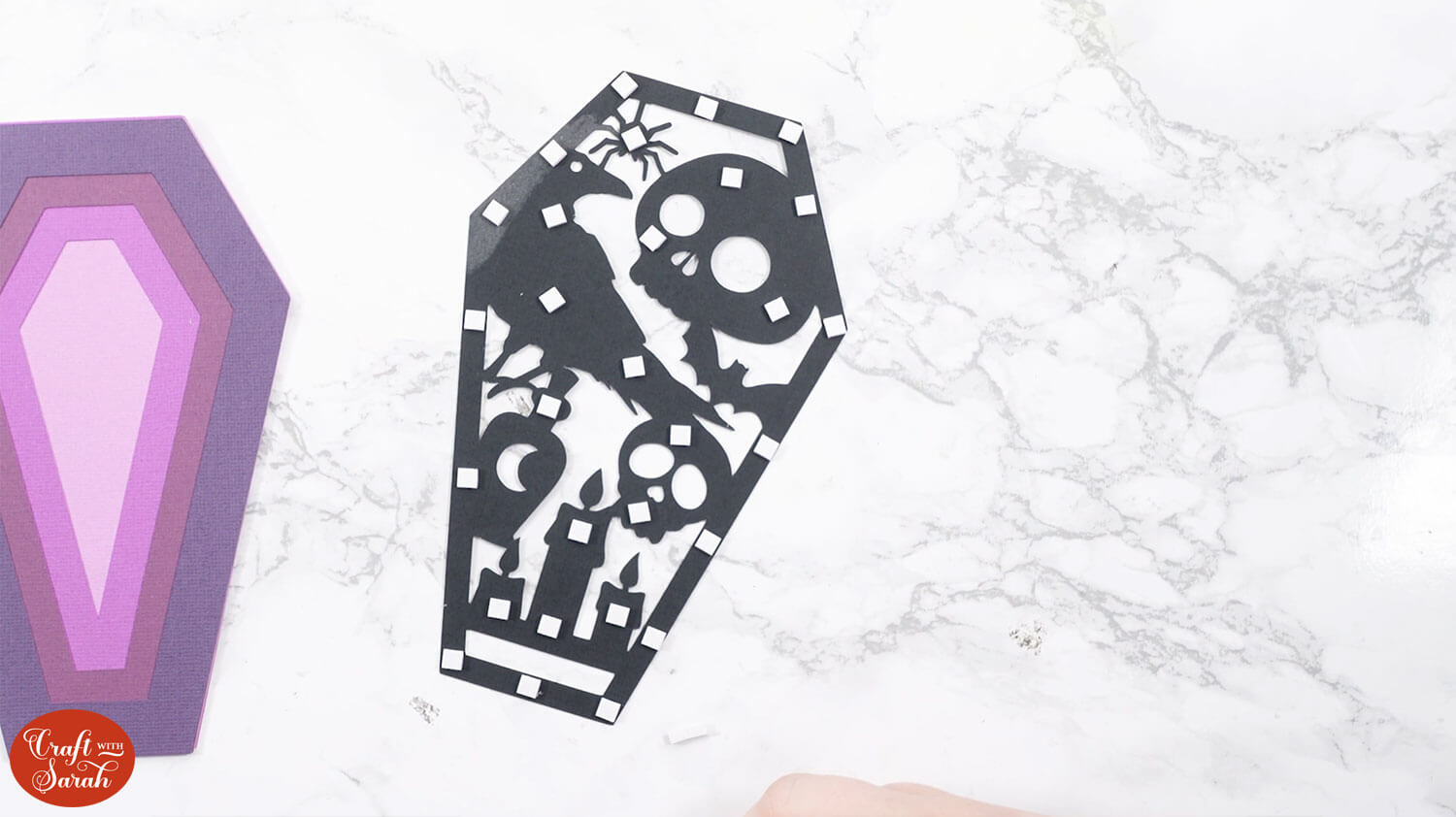 Use foam squares to attach the black layer with the decorations inside the coffin outline.