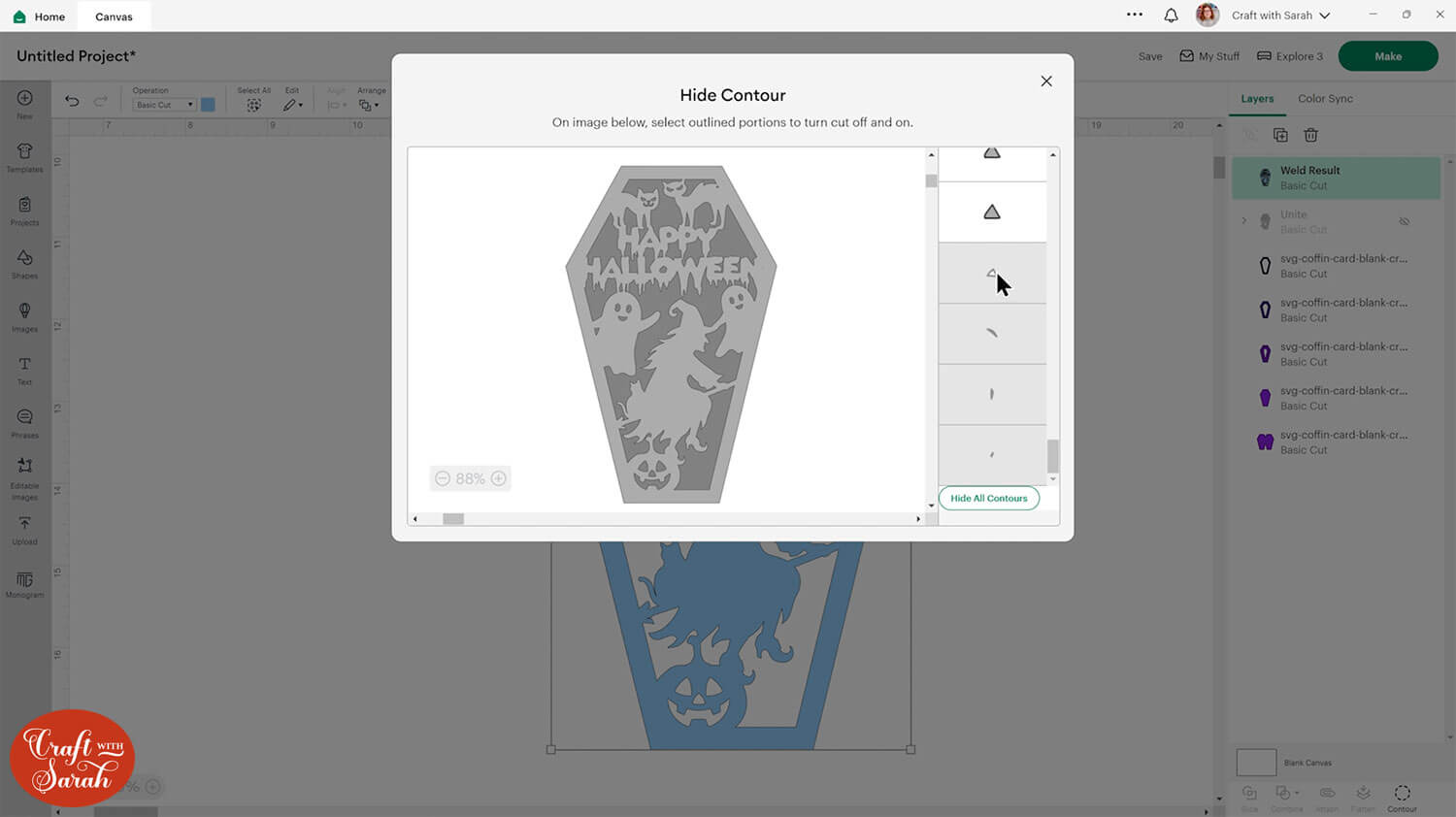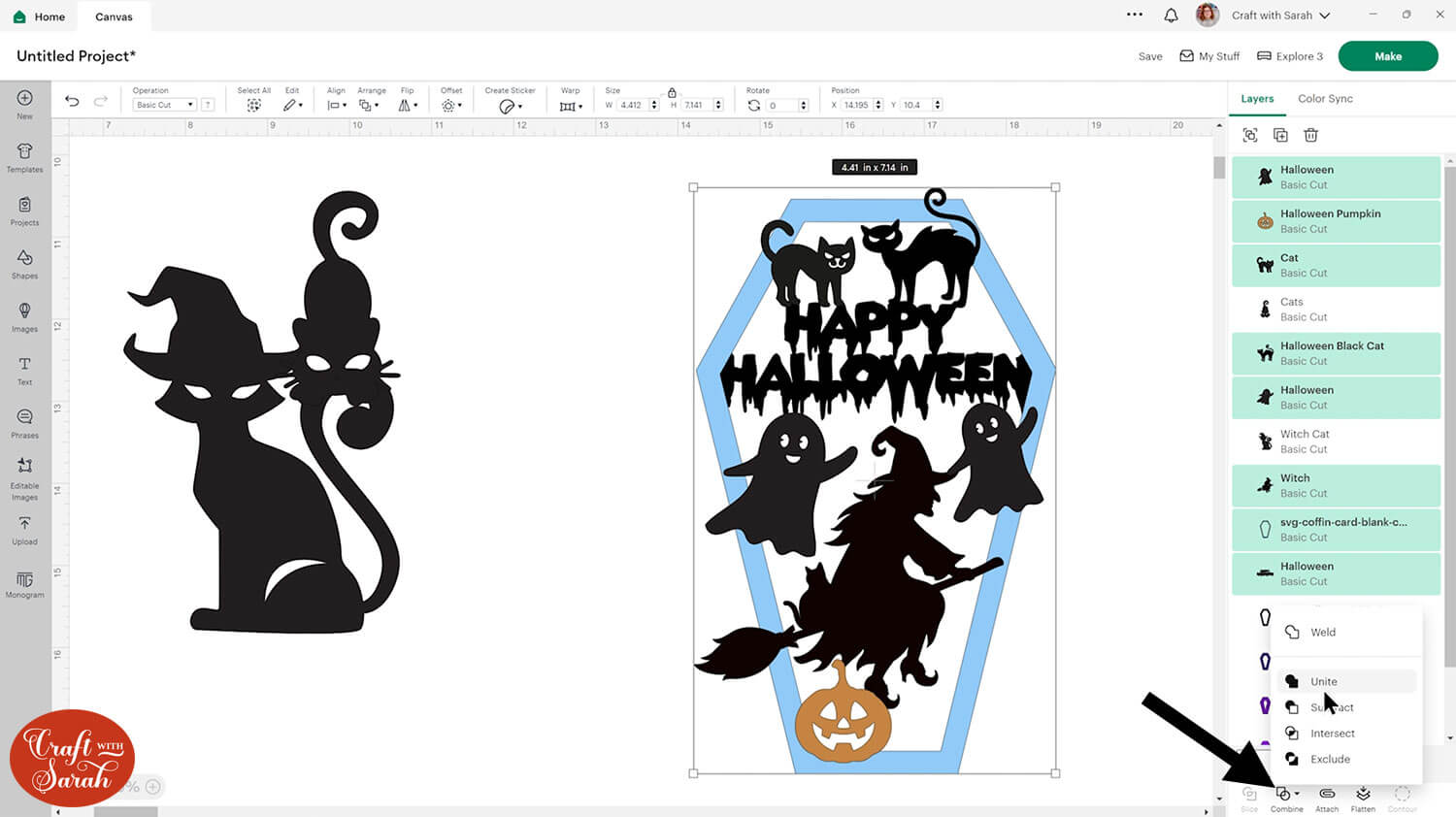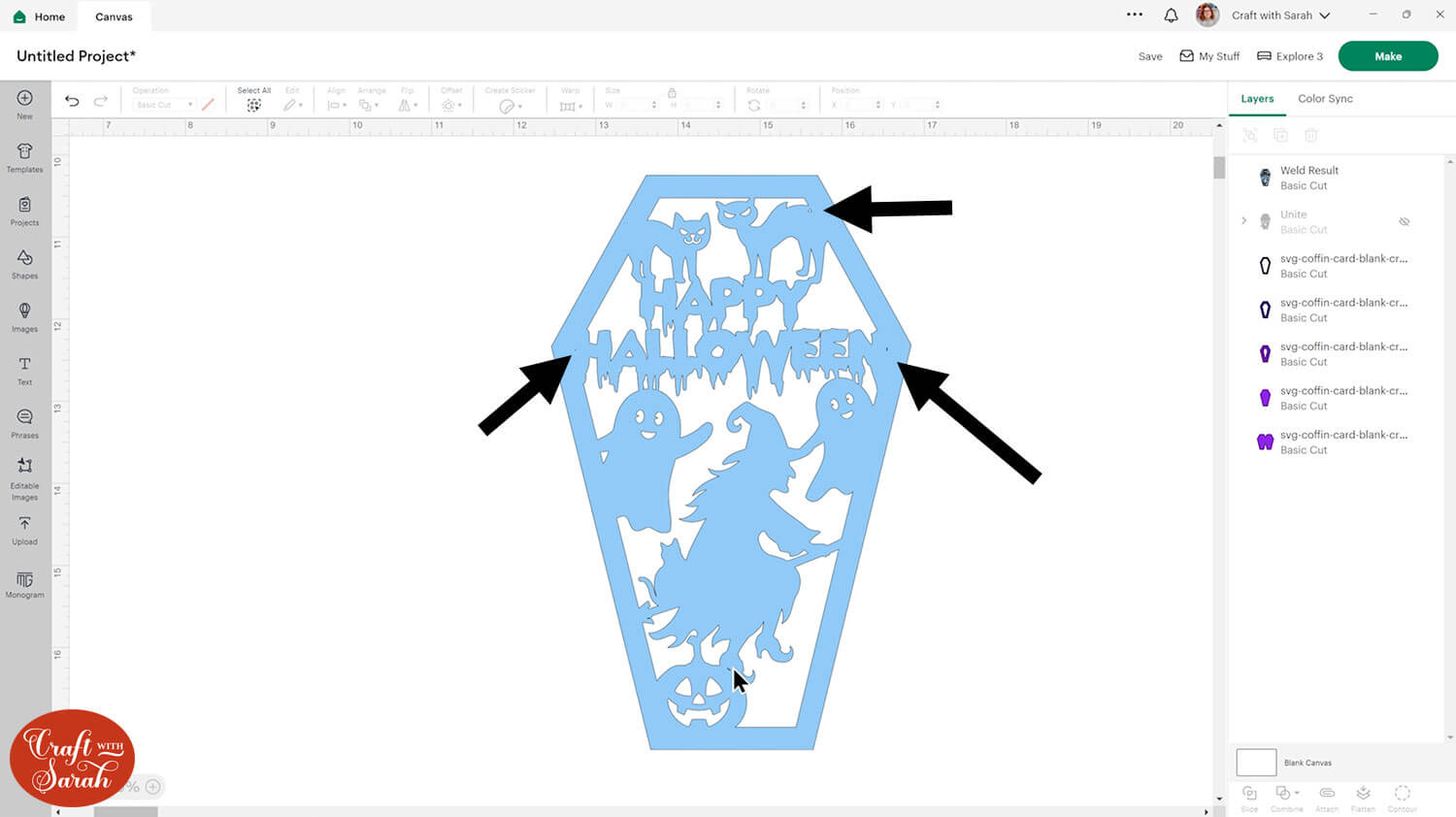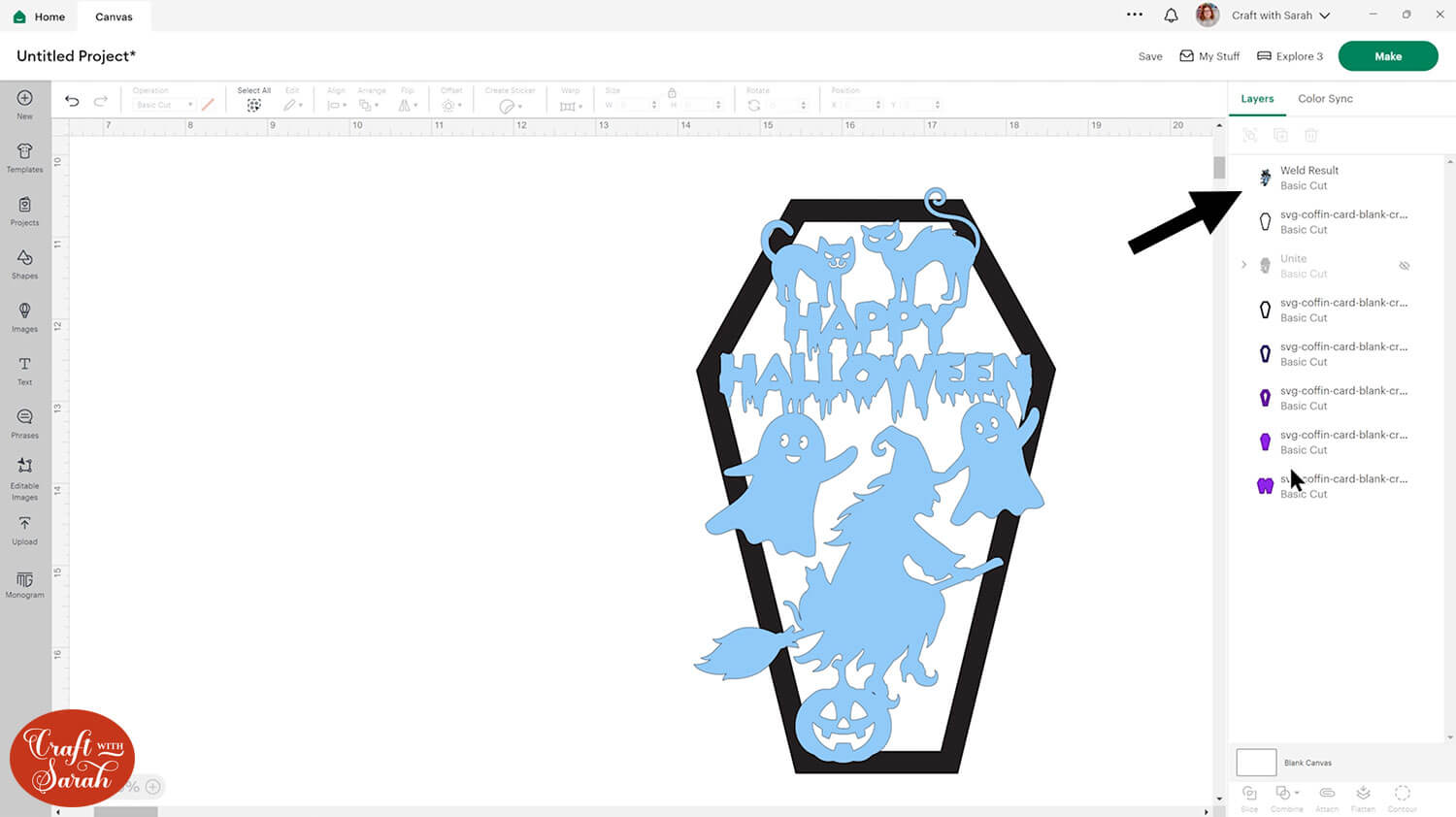 To join all the images to the outline so that it cuts as one piece, select everything and press “Weld” at the bottom of the layers panel.