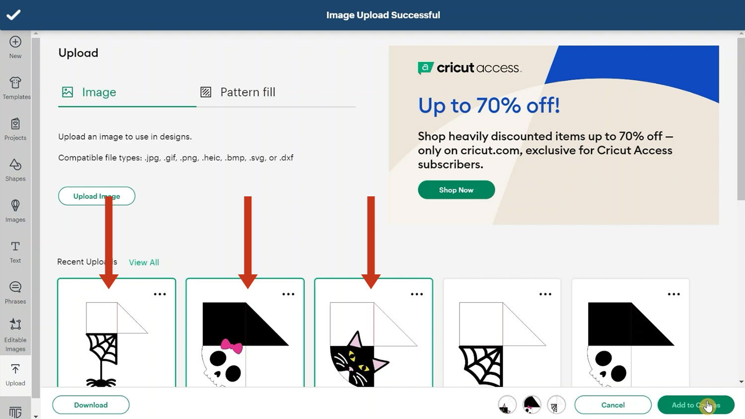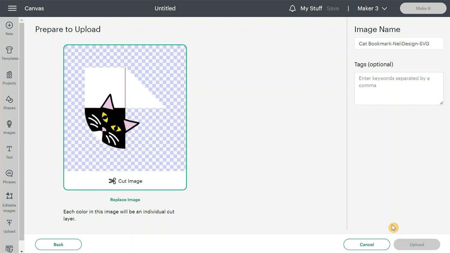 Open Cricut Design Space and start a new project. Click Upload, then Upload Image and drag and drop in your files or click Browse.