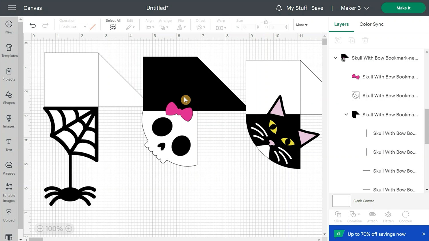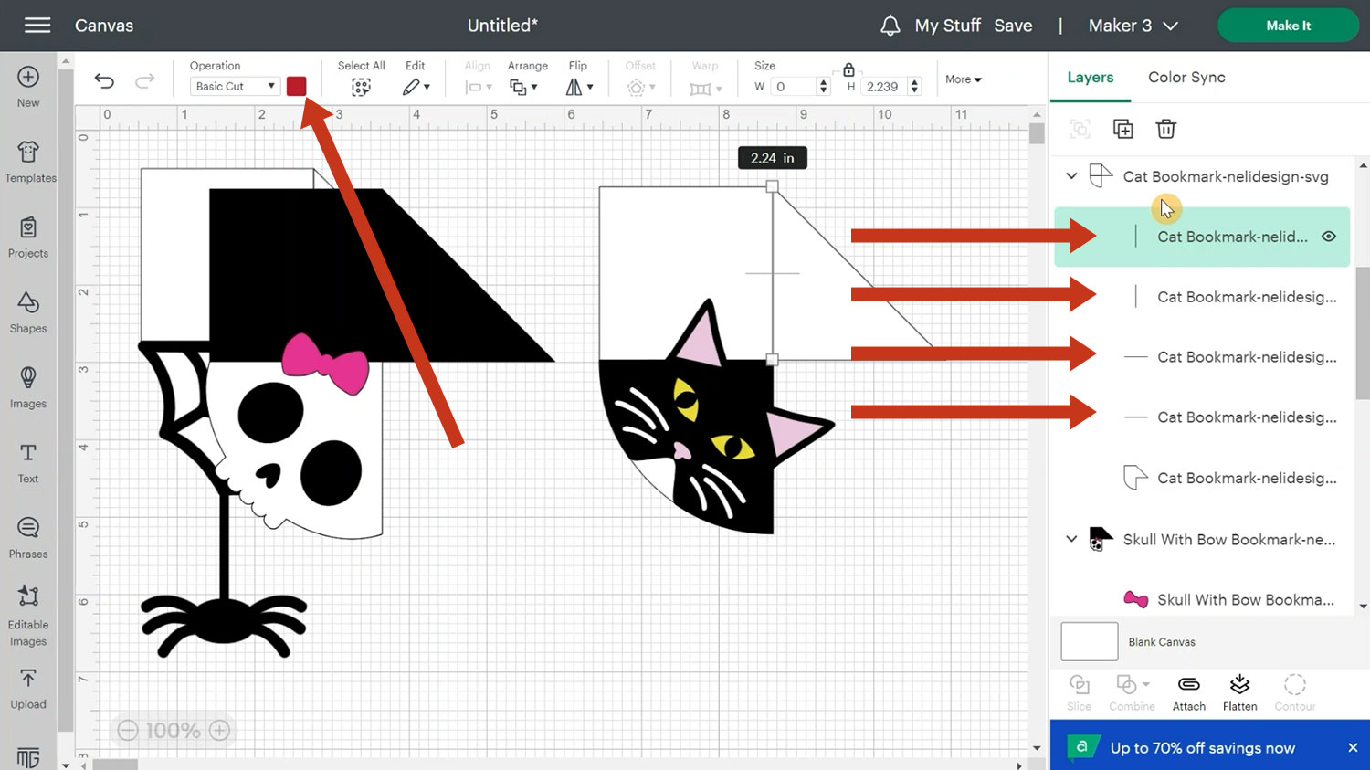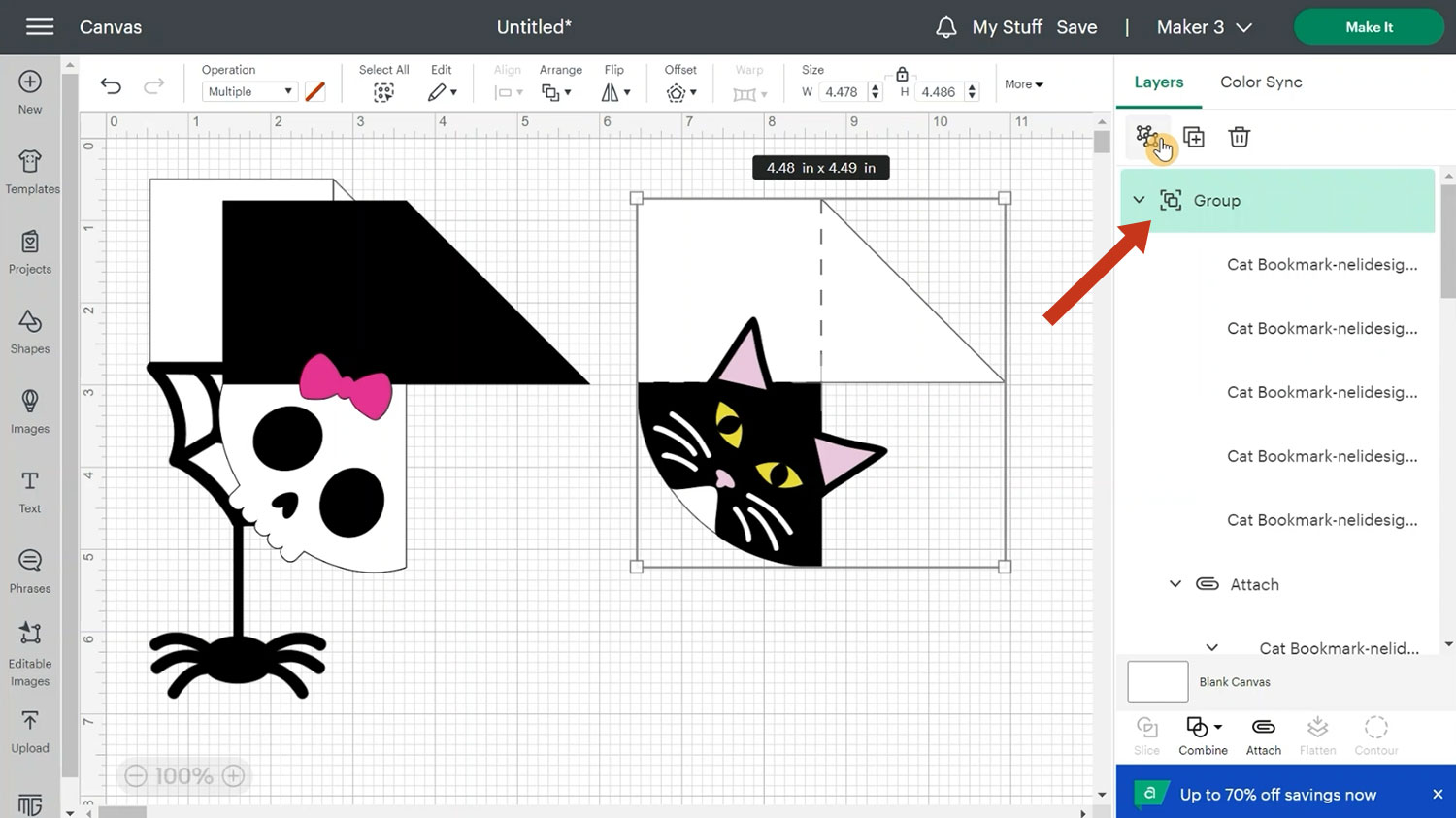 Starting with the cat design, you will see it is made up of multiple layers. Every bookmark will have a group inside a group. The bookmark includes 4 scoring lines and the design goes on top.