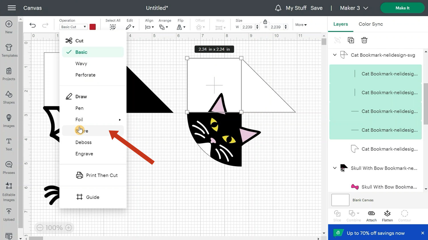 If you have a Cricut Joy you won’t have the Score option but instead, you can click Foil and use the foil tip to do the scoring for you. You will also have to resize the design to 4.25 along either the height or width but make sure the padlock icon is closed.