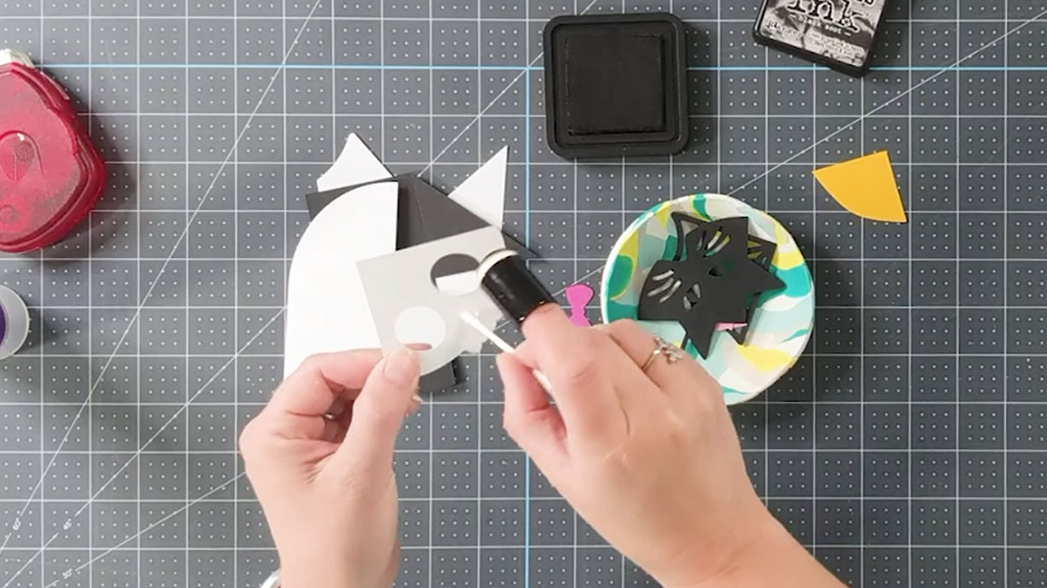 Glue on the pink ears and nose to the cat.
