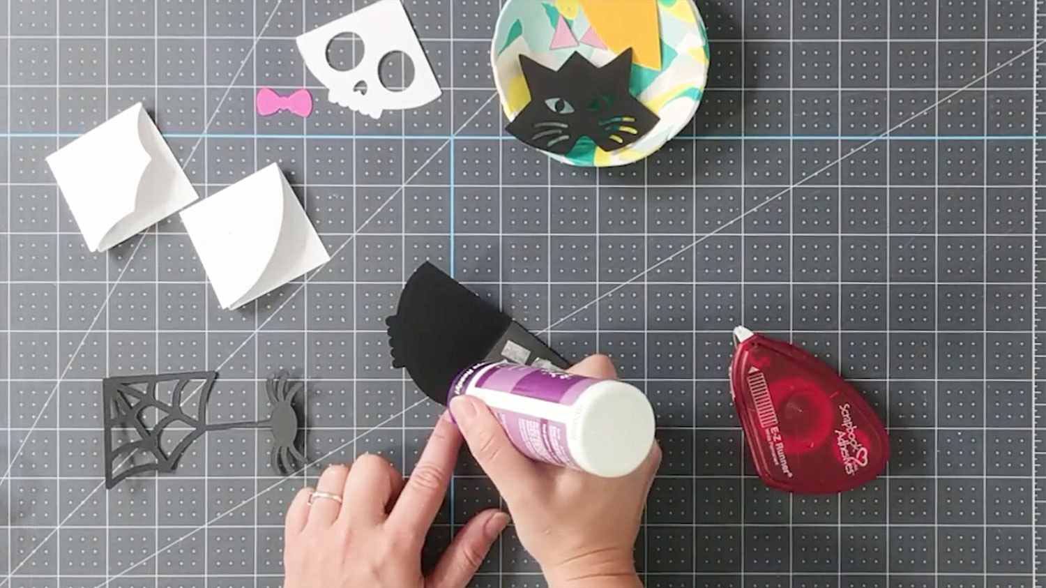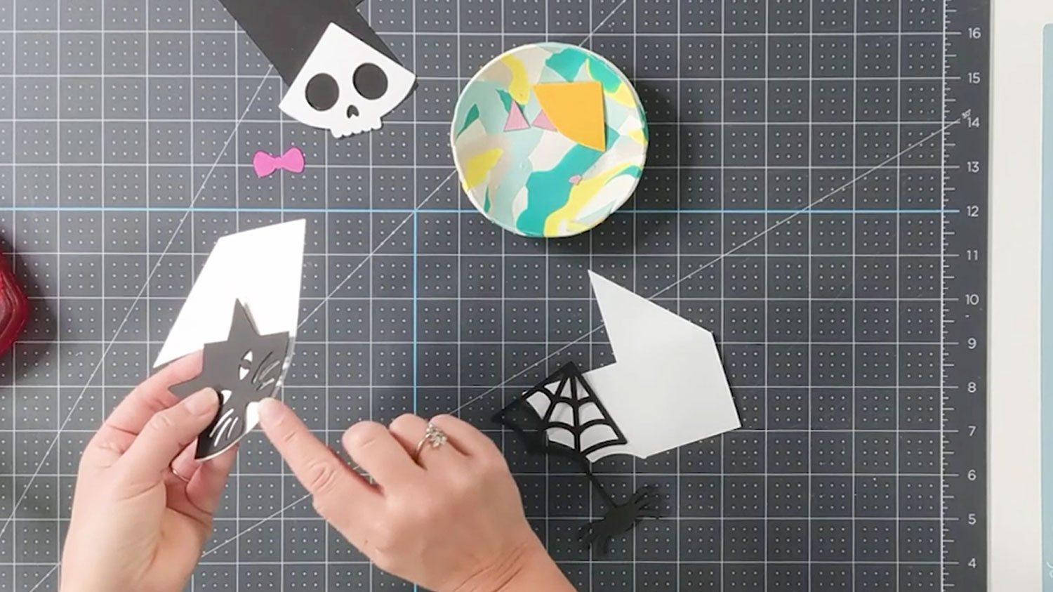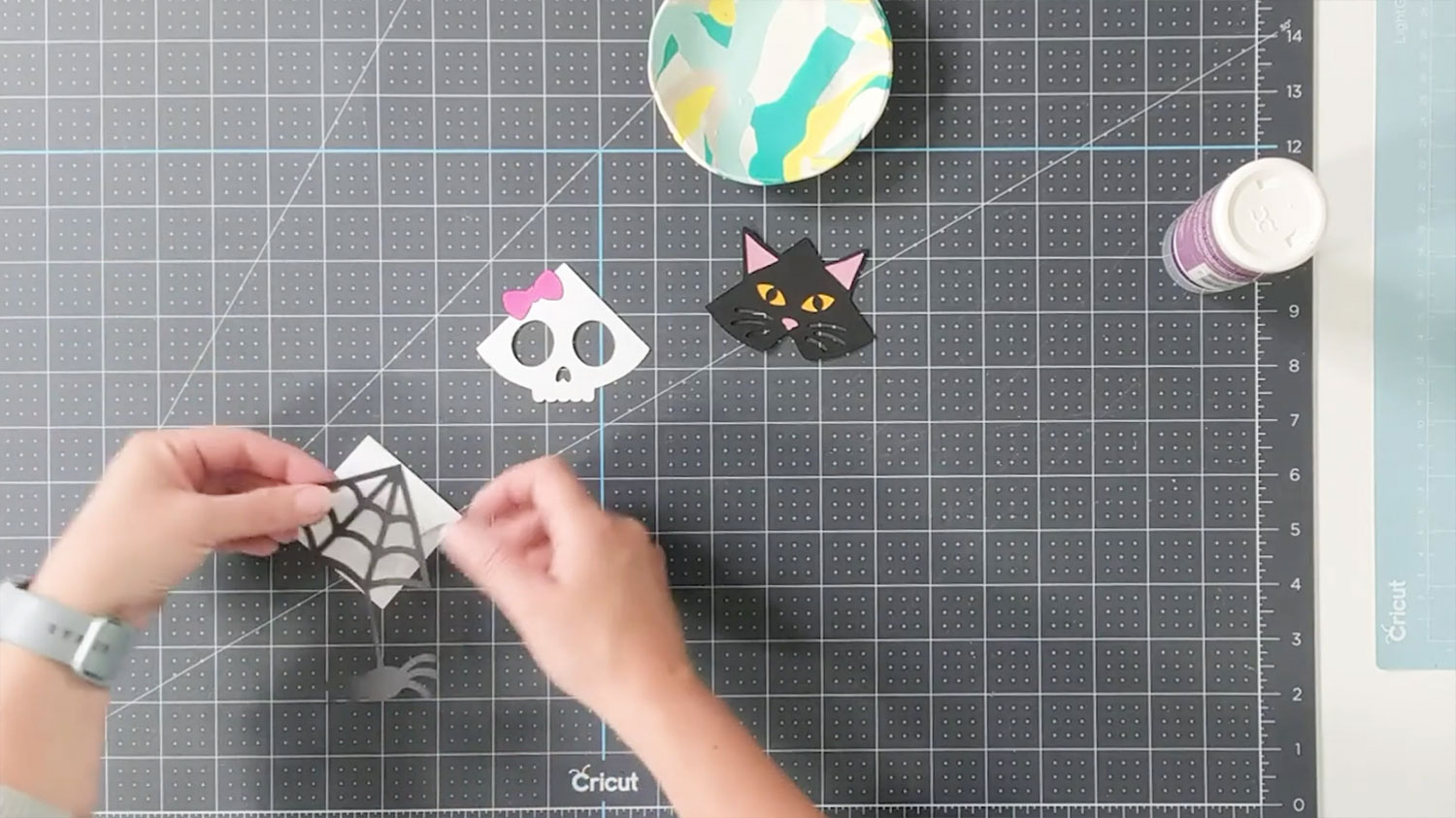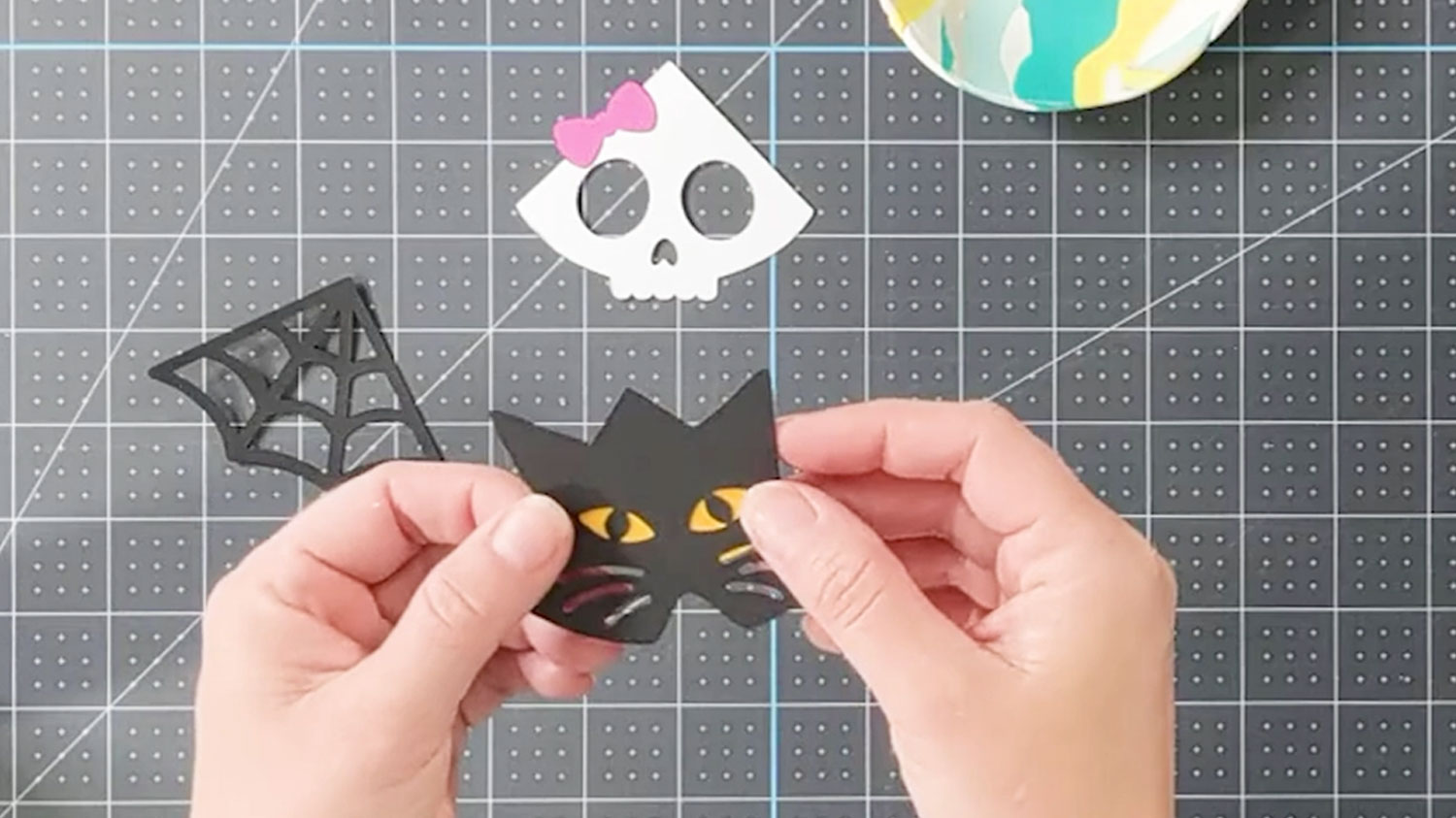 This tutorial focuses on making three of the Halloween corner bookmarks: the spider, skull and cat.