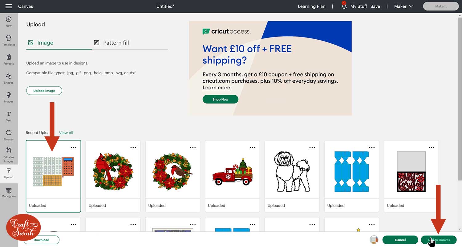 After uploading, the design will appear in your recent uploads. Click it to get the green border, then press “Add to Canvas”.