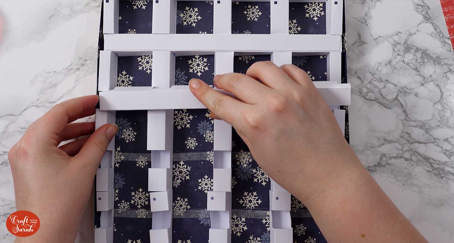 Add double-sided tape down the middle bits in the draw lines. You will also need to add tape to the sides of your grid pieces that touch the edge of the box.