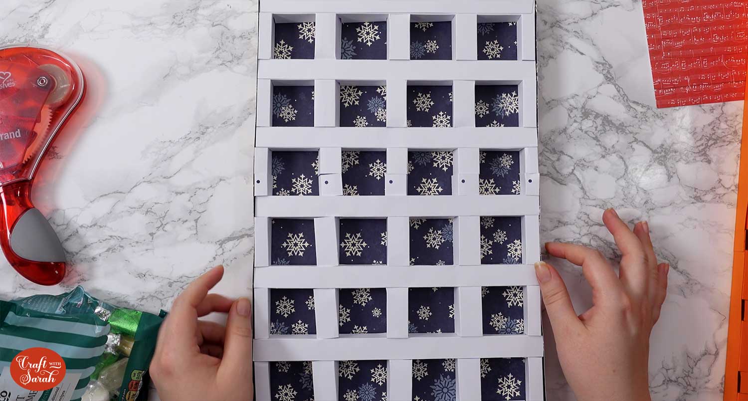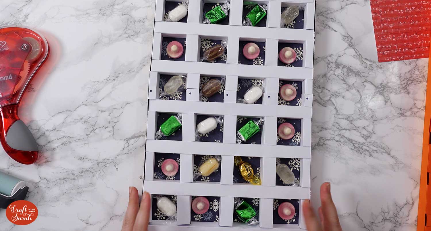 Look out for the top 4 squares (the bits with the square cut outs). This will be the top of the calendar that’s covered with your name, so you do not want to add sweets or chocolate to the top row as they won’t have doors.