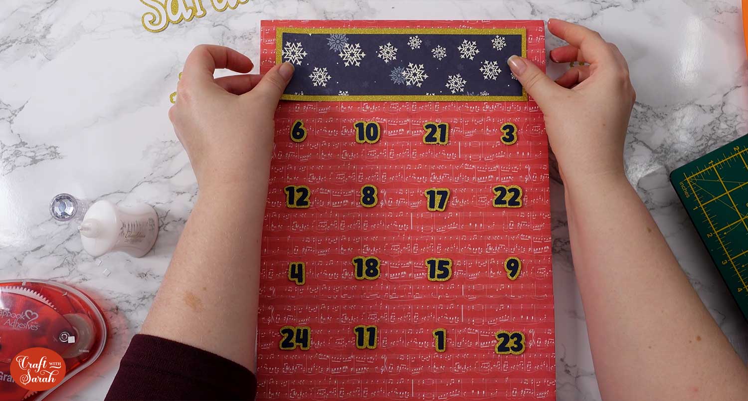 Use glue or foam squares to attach the decorative rectangles to the top of the advent calendar.