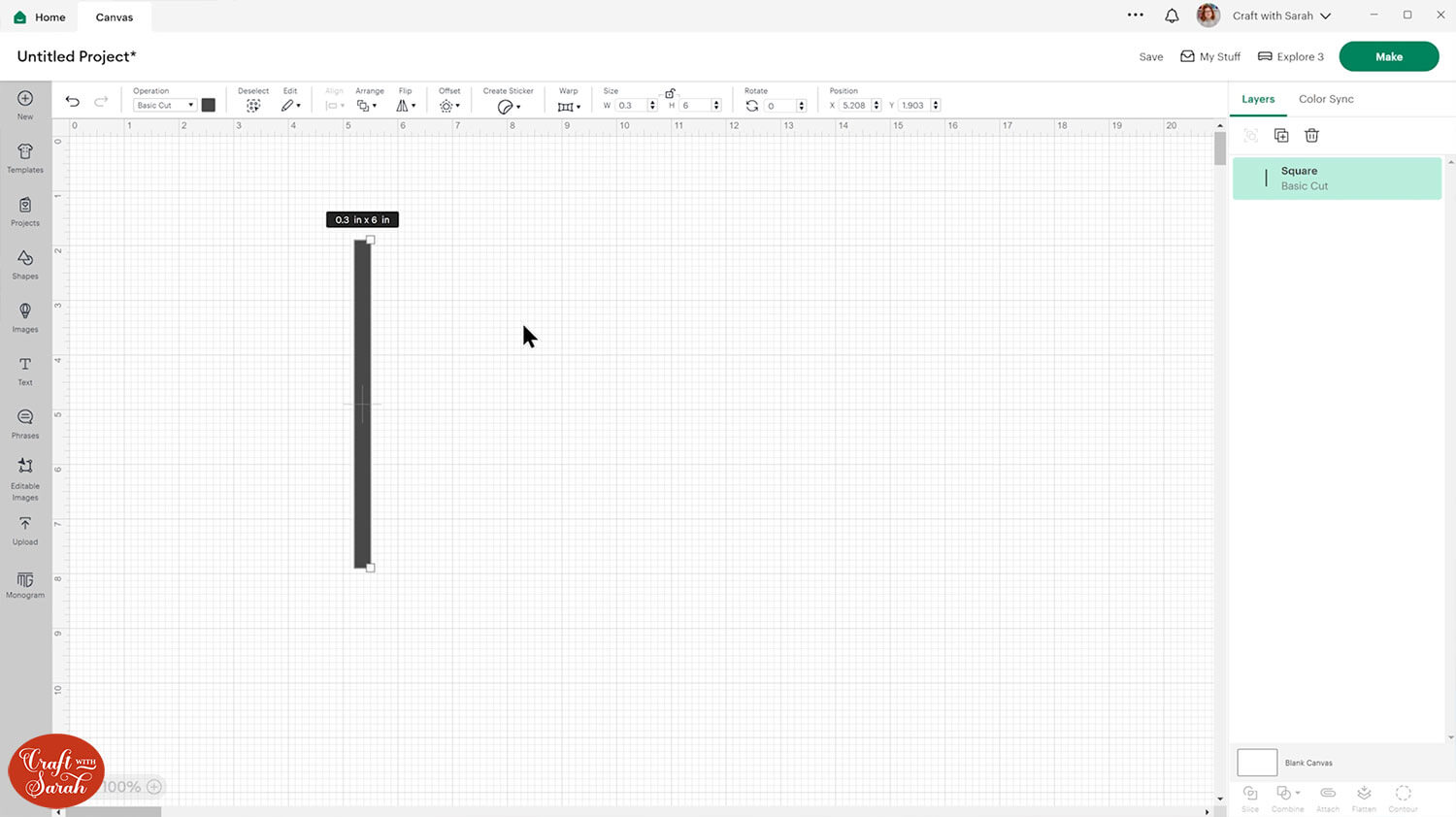 Resize to 0.3 inches wide and 6 inches tall. You can change the whole size at the end of the project, but that’s a good size to work with at this point.