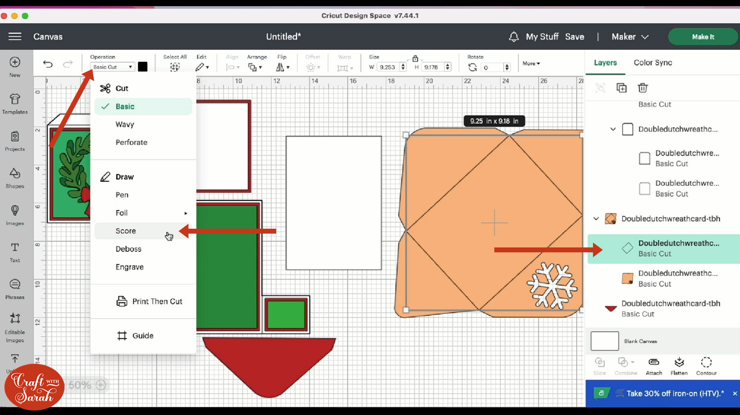 Do the same for both the main card piece and the little tab piece so that the single-line layers on them are changed to “Score” and attached to the relevant pieces.
