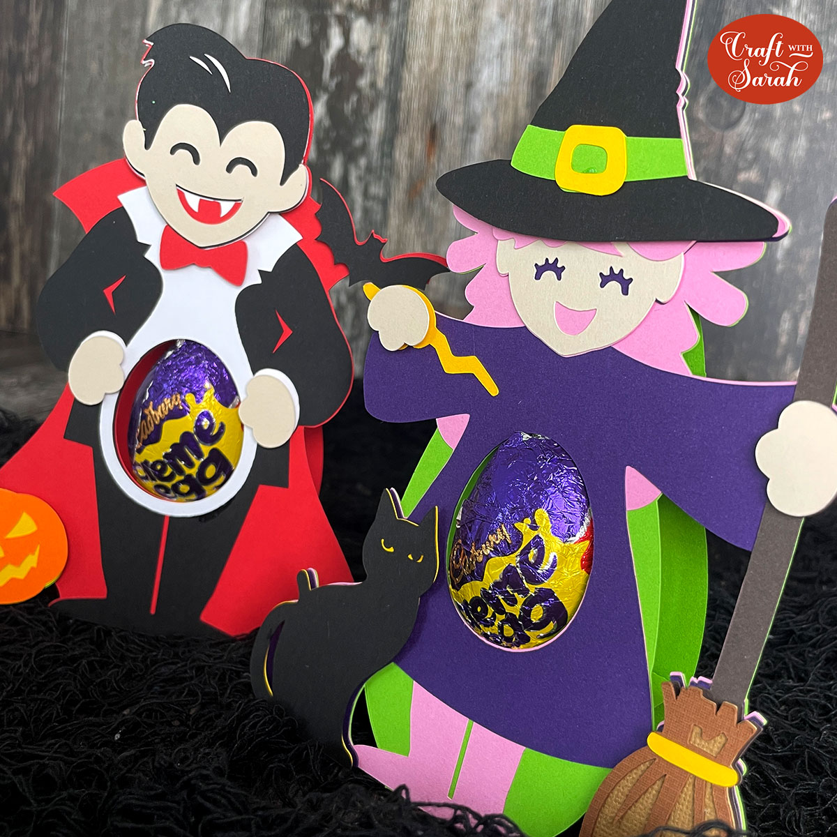 Mmm, chocolate!! Today’s fun designs are these cut witch and vampire chocolate egg holders.