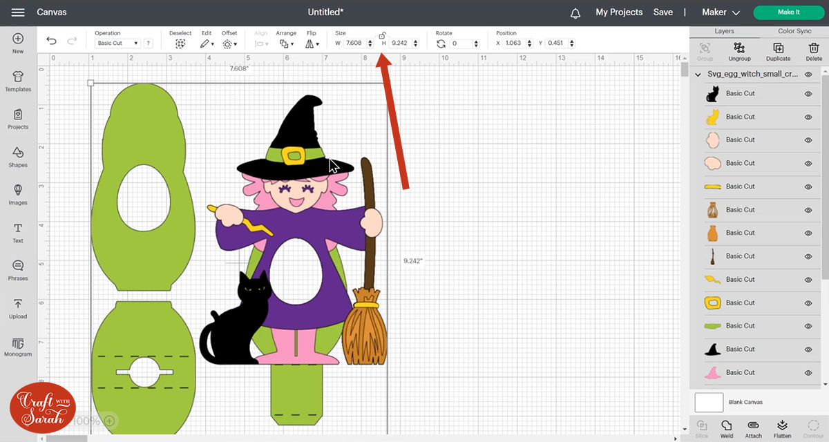 - Witch – Large (Kinder size) – 9.745 inches wide, 11.57 inches tall
