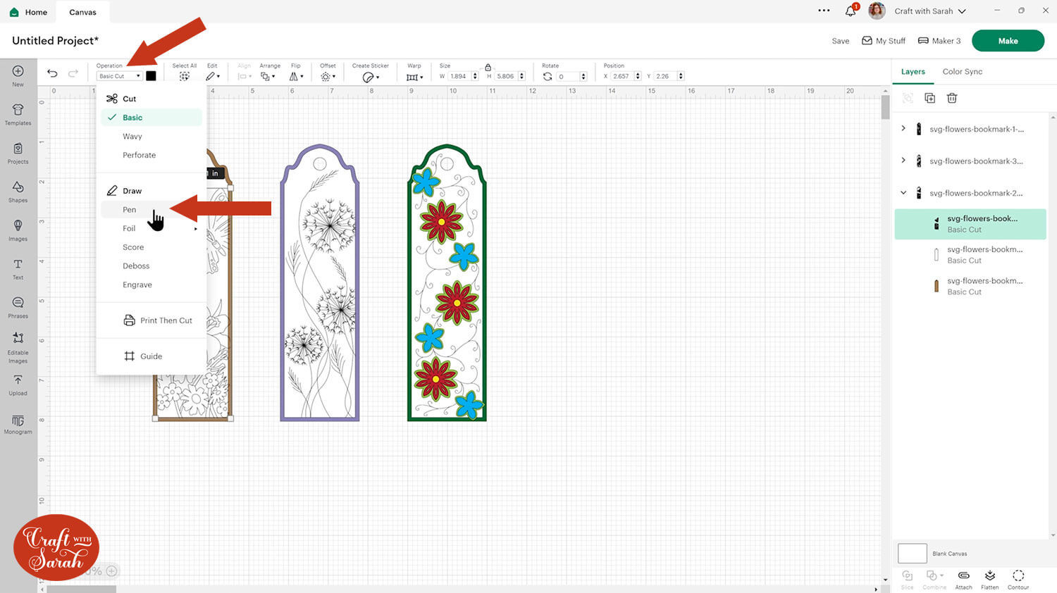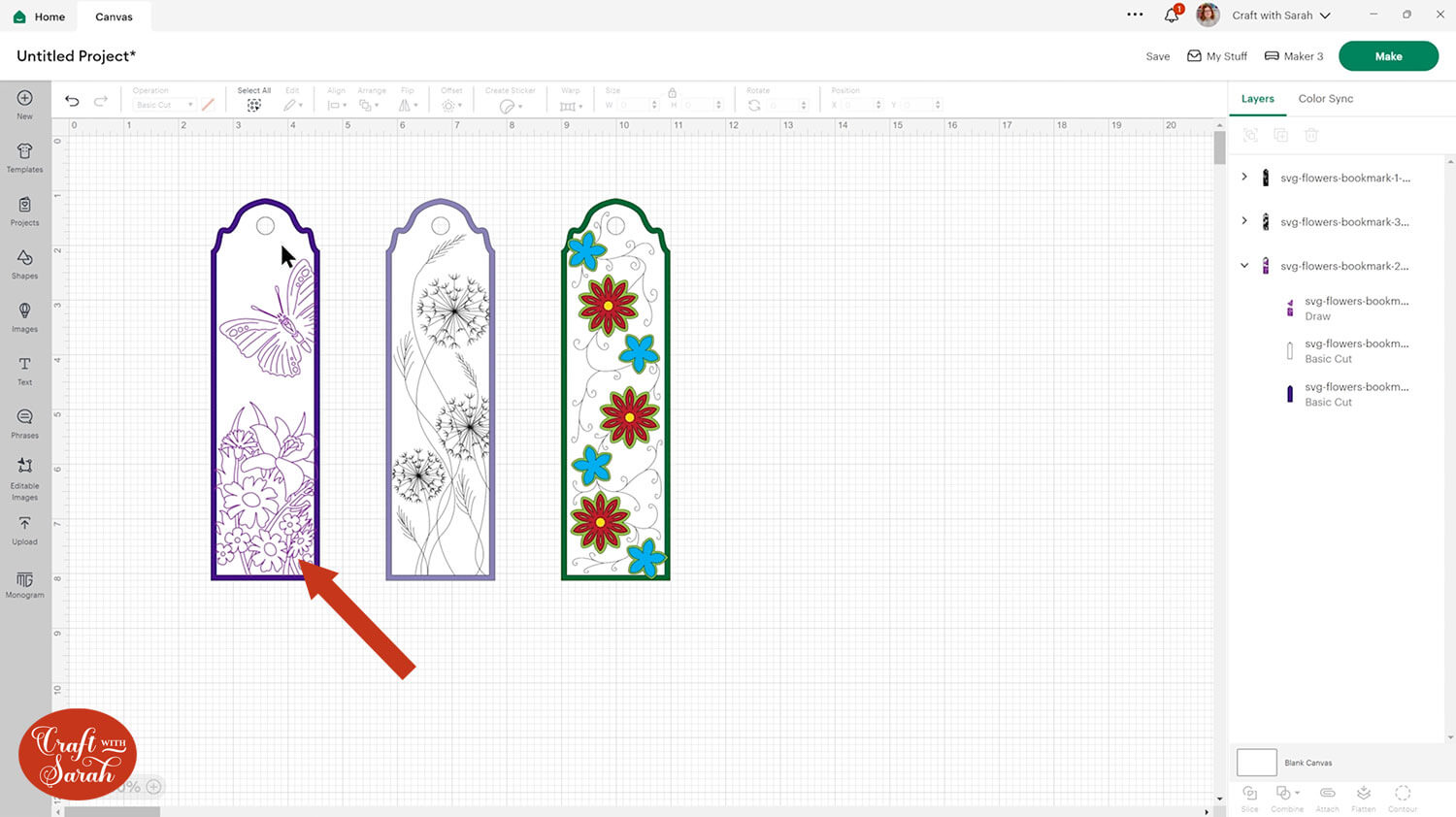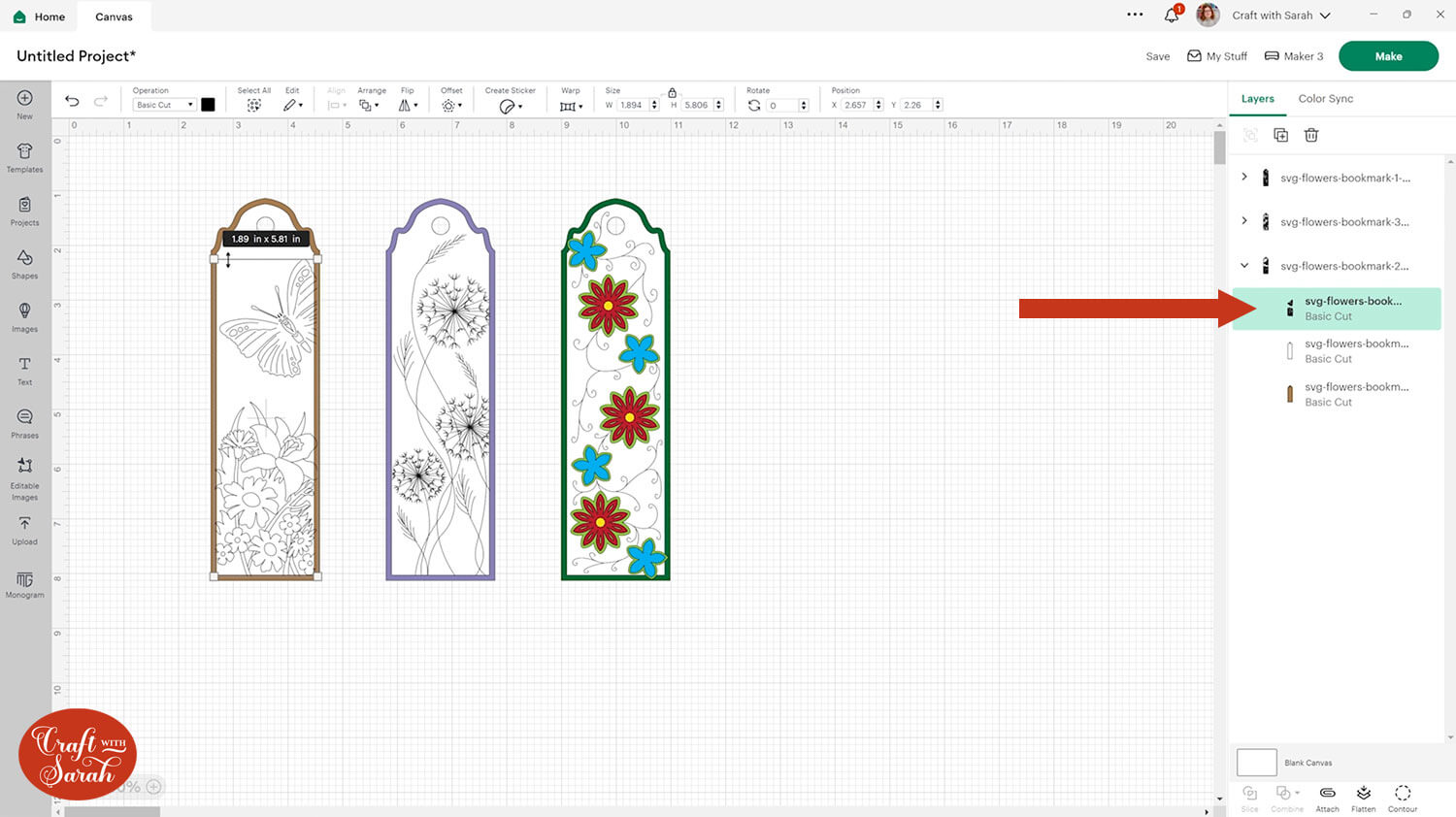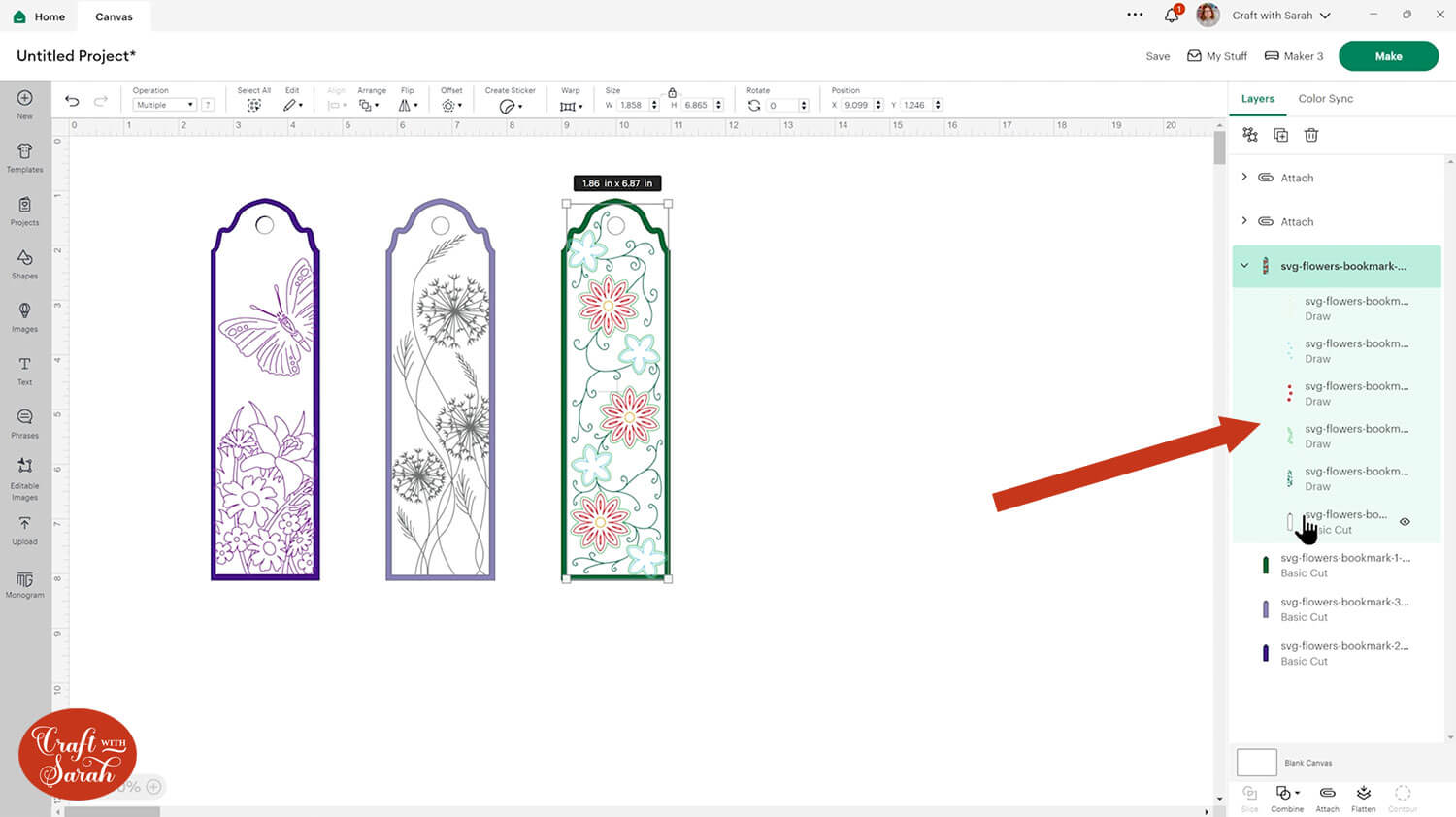 For each bookmark design, you can click on it and open up the layers panel by clicking the little arrow. You’ll see there are different layers – some for the base pieces of card that we will be cutting out, but some that need to be switched to “Draw” layers.