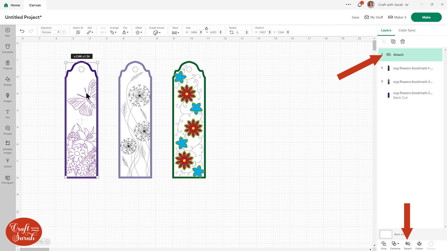 Click on the bookmark design and separate the layers by pressing the “Ungroup” button at the top of the layers panel.