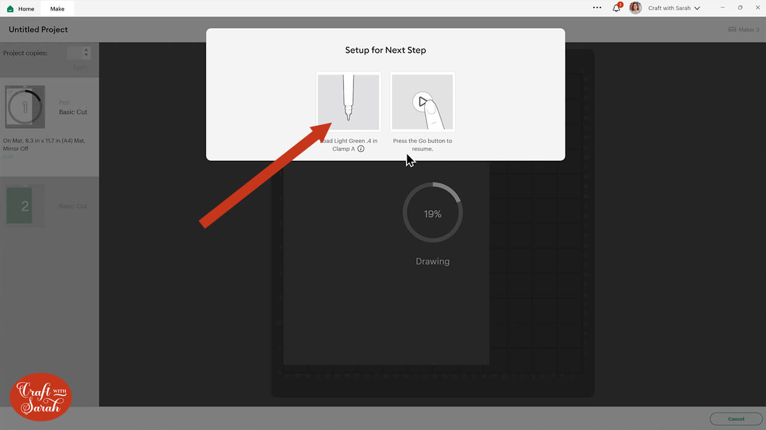 Make sure you’ve got the correct Cricut machine selected on the top-right of the screen because different types of Cricut machine need different types of pen.