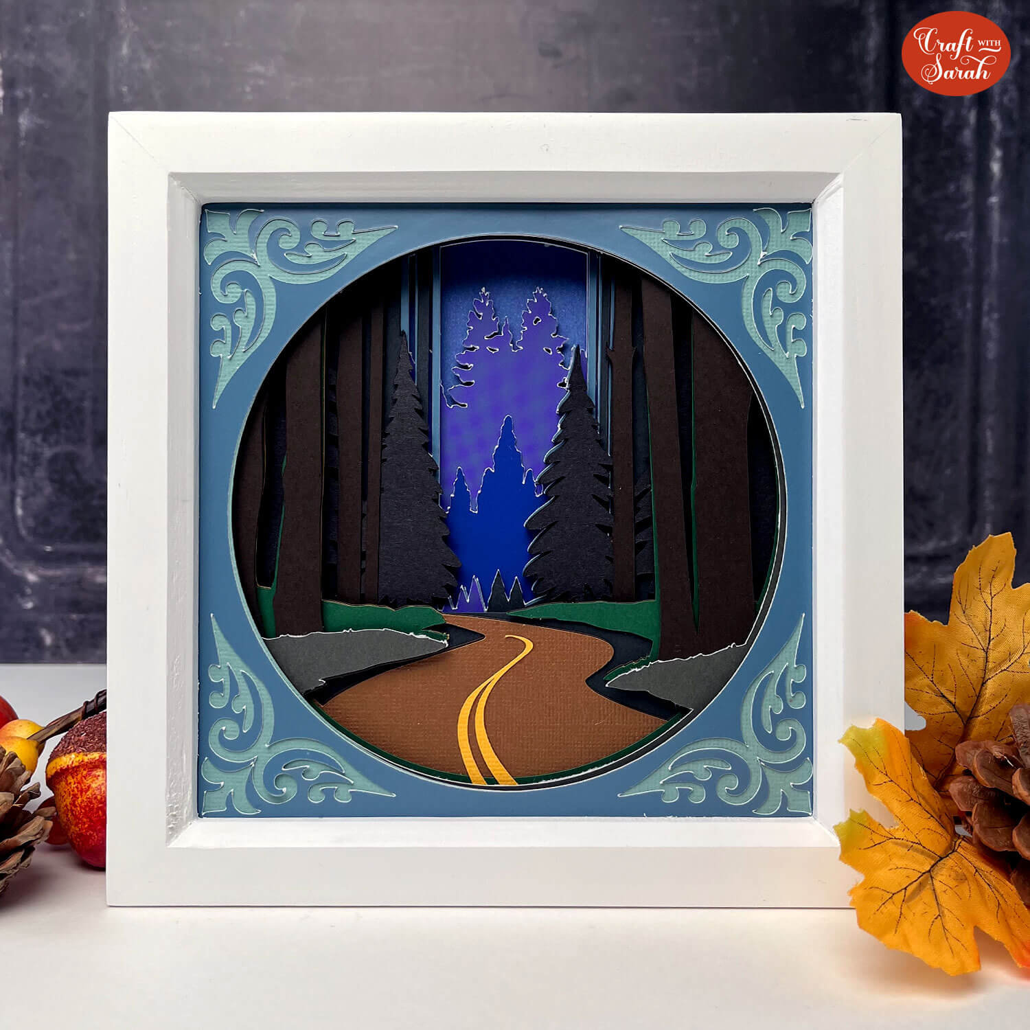 Inspired by those classic moments when you just know something bad is going to happen, I’ve created a forest highway-themed shadow box that captures the eerie tension of those scenes.