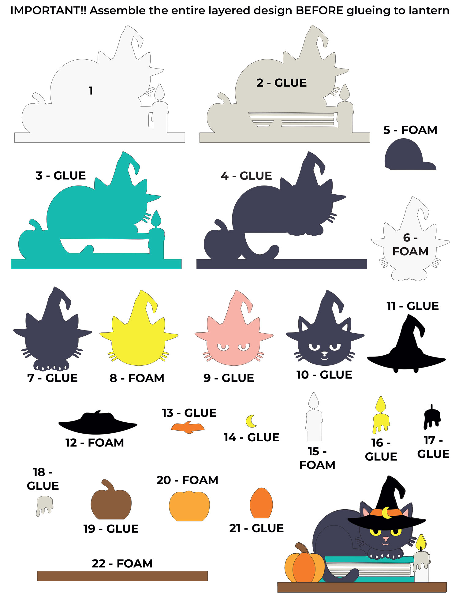The pictures below show the steps for the Halloween cat lantern.