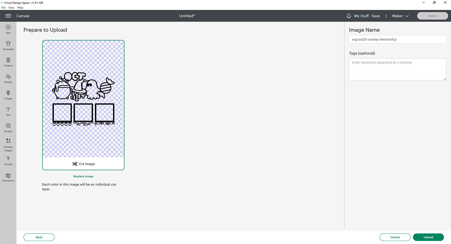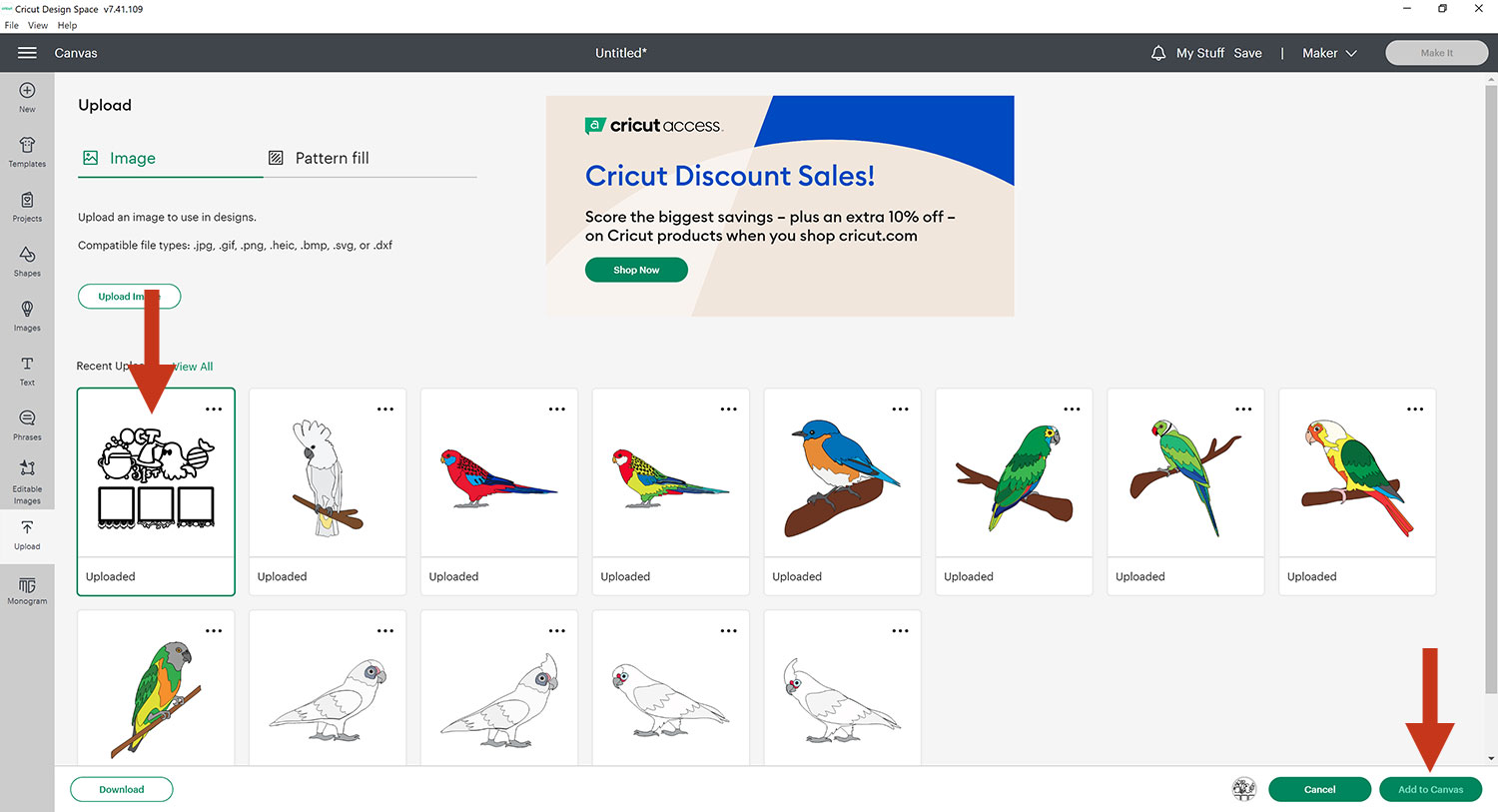 Click the design in your Recent Uploads and press “Add to Canvas”.