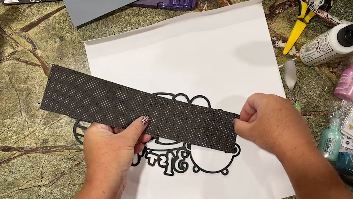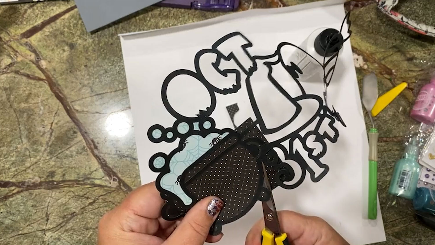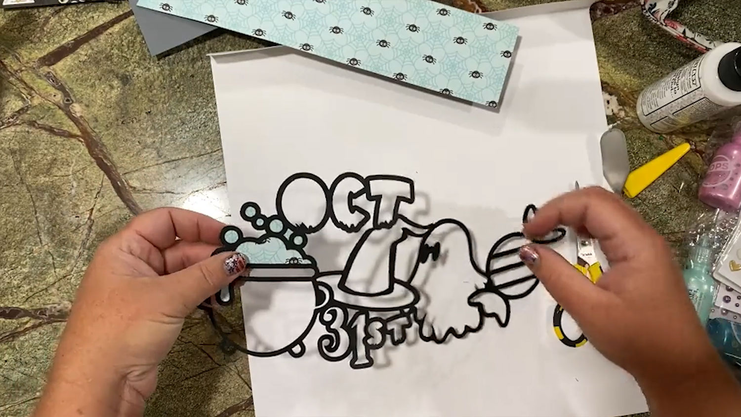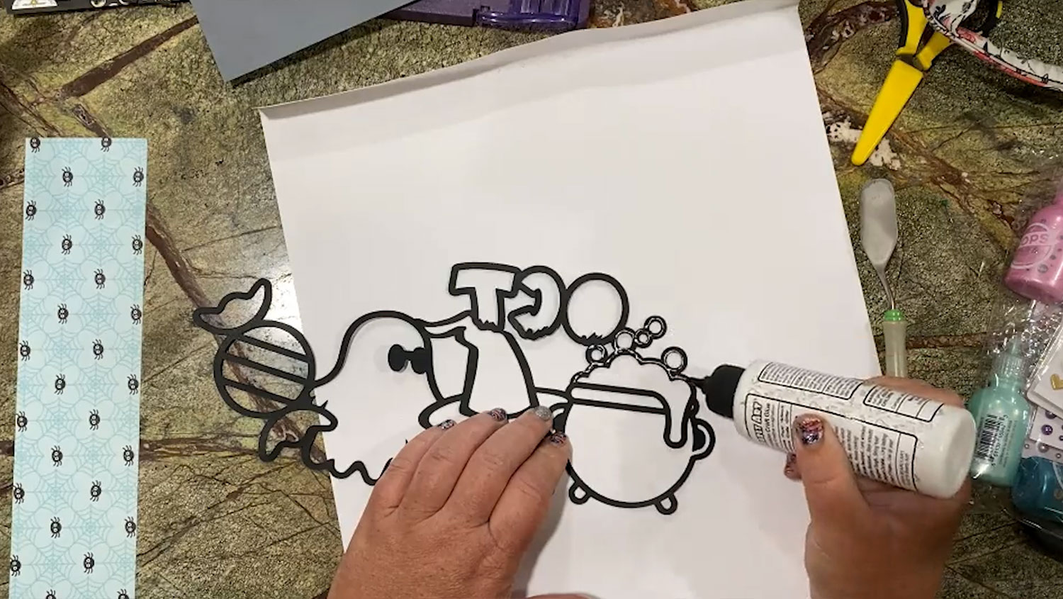 Glue the back of the outline that you want to begin with. Rhoda started with the bubbles pouring out from the cauldron.