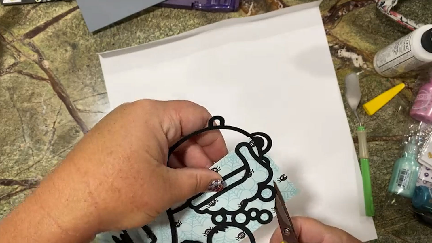 Continue to place different chunks of pattern paper over each of the different sections and cut around them until the outline is filled.