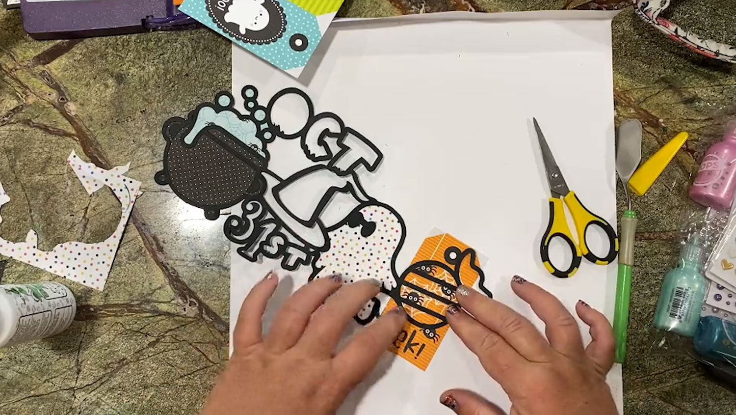 Rhoda used stars, eyeballs, stars, shapes and a trick-or-treat speech bubble. You can use whatever you have in your stash.