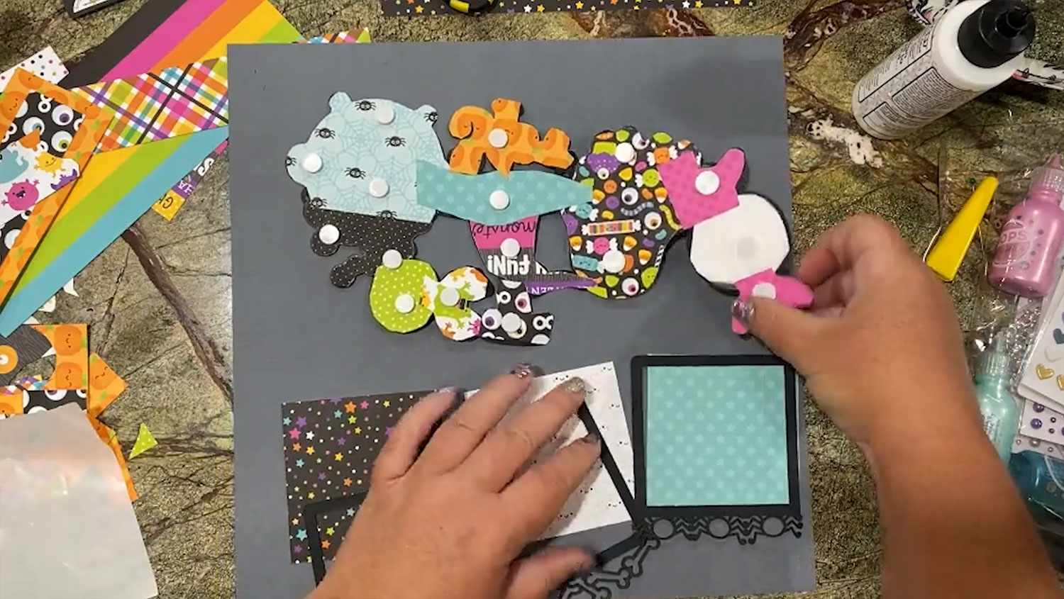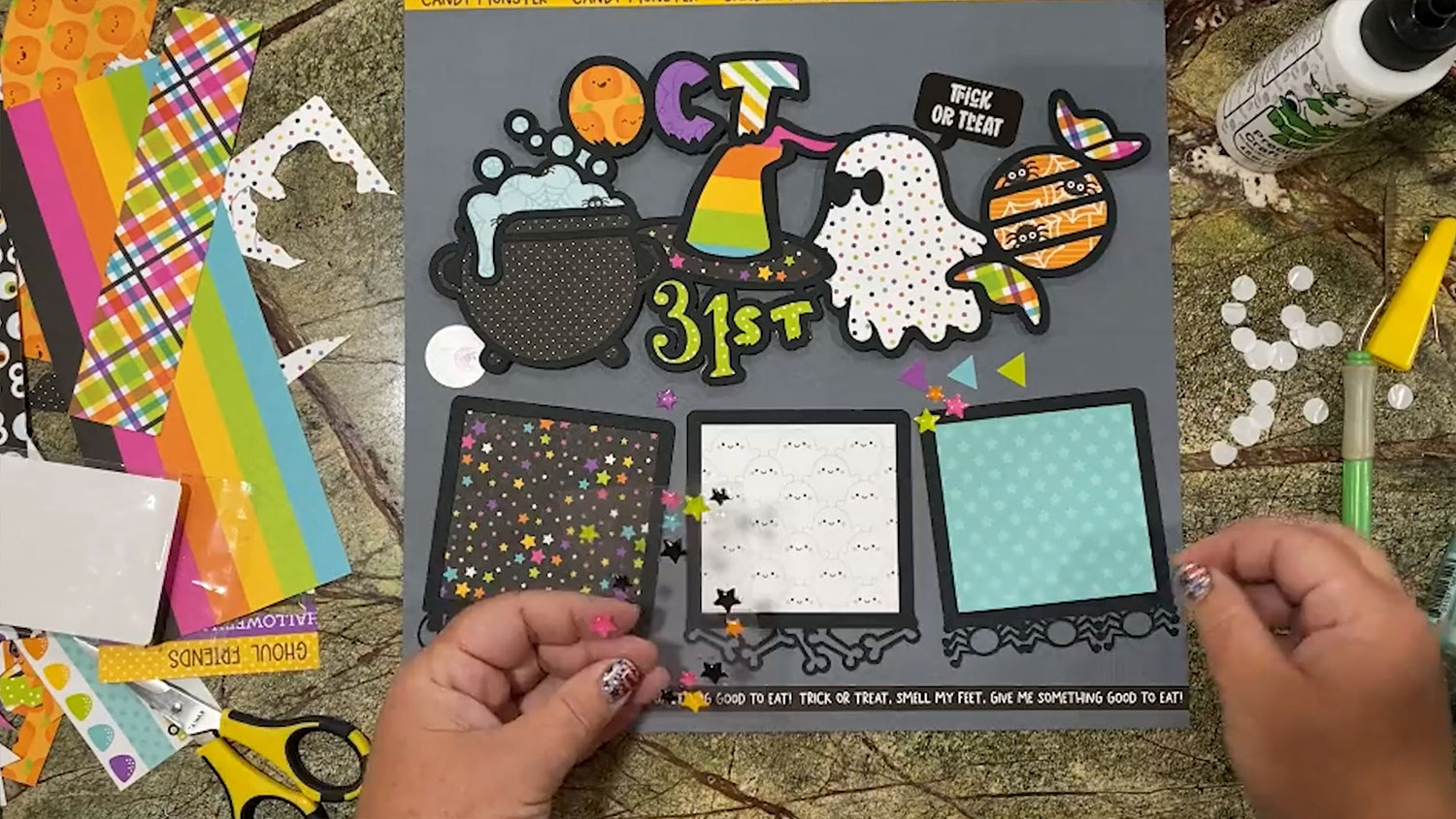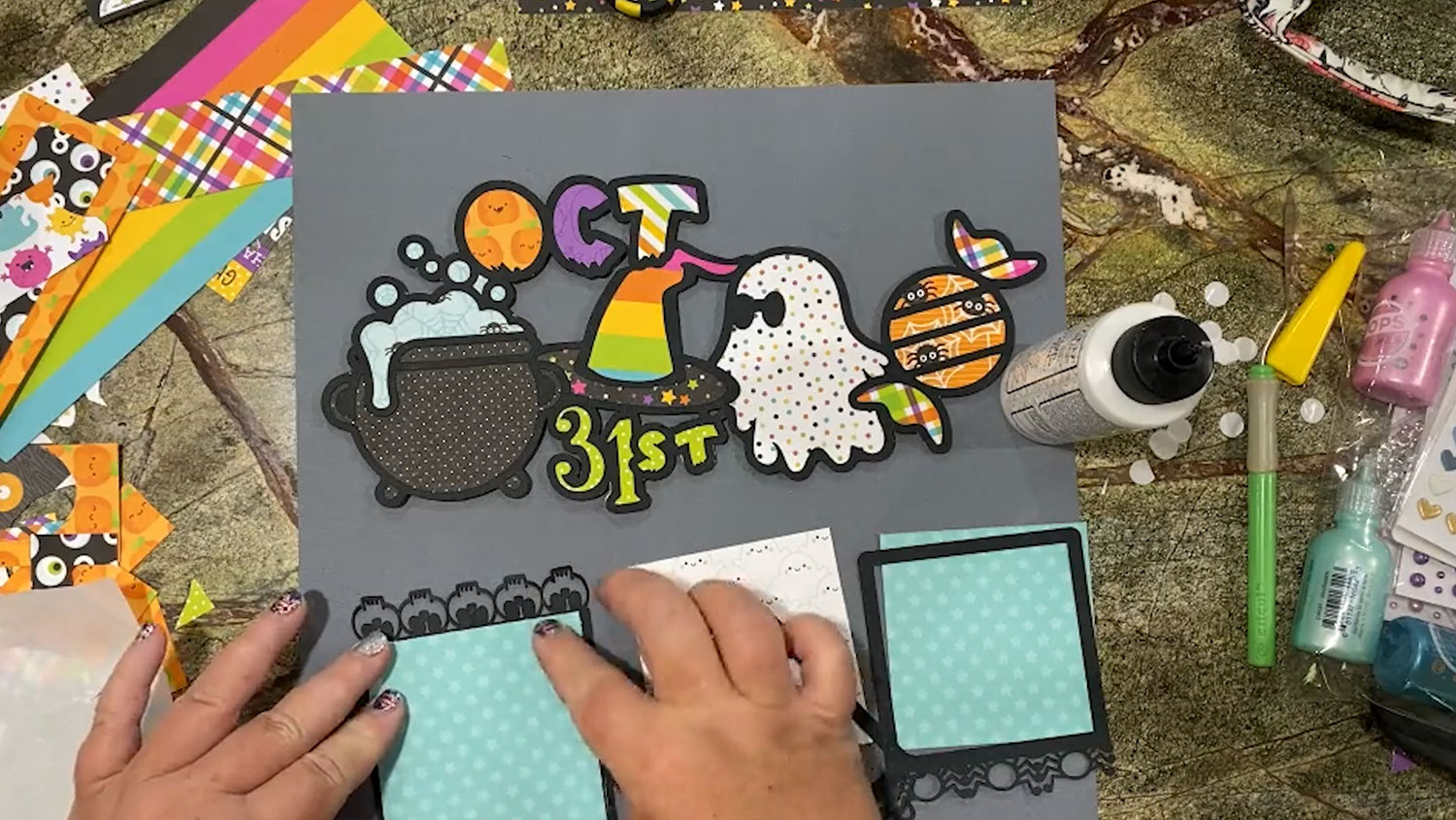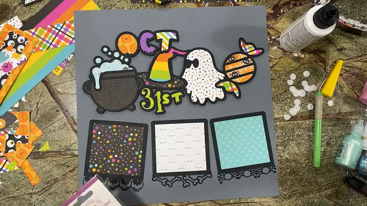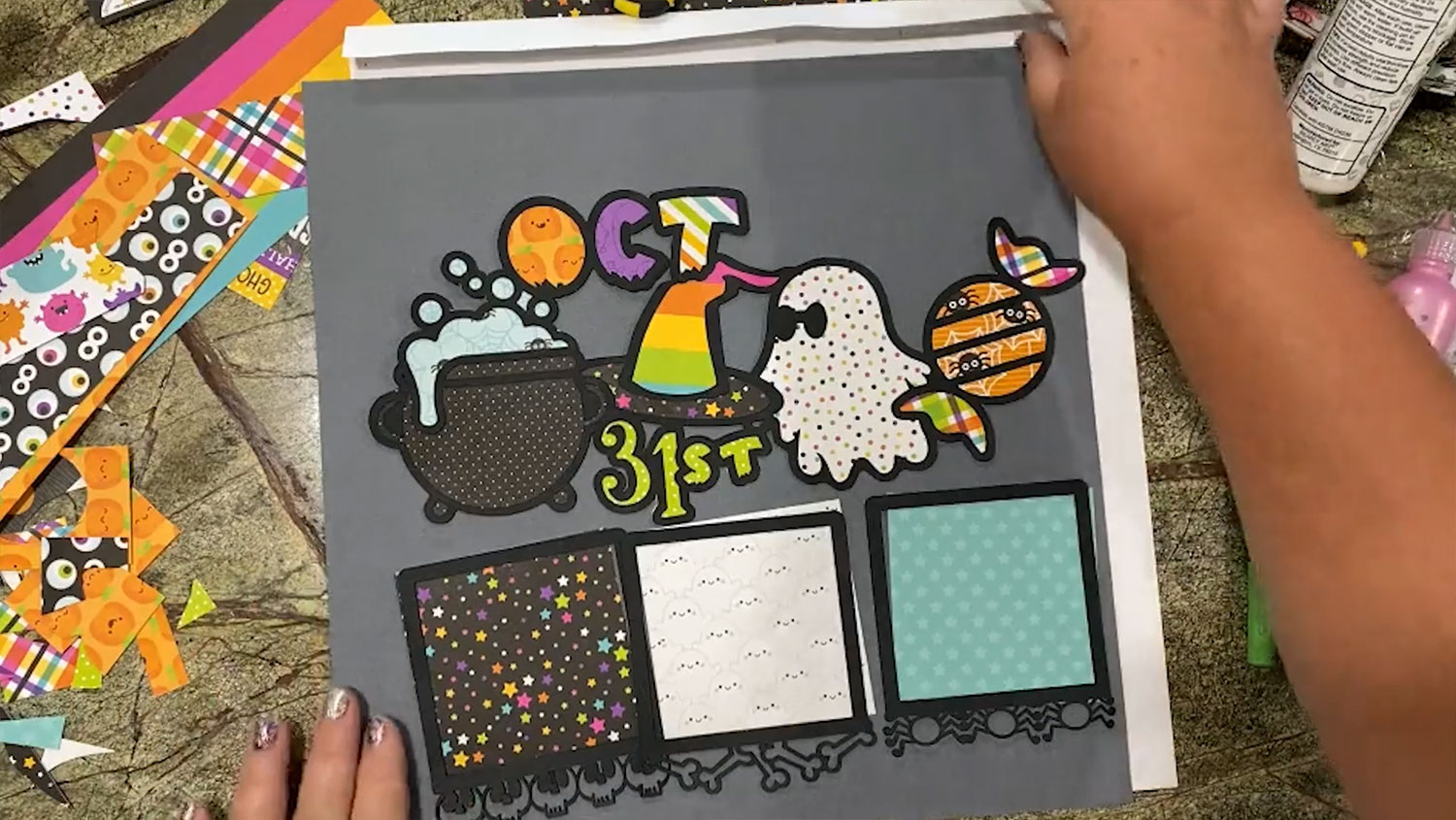 Grab your Halloween stickers, toppers and other decorations and embellish your scrapbook page.