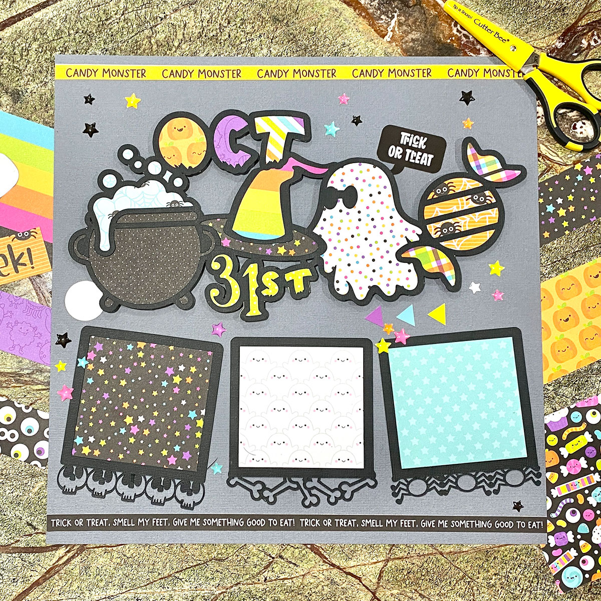 You can also use strips of your patterned paper along the top and bottom of the page. Rhoda used an orange “Candy Monster” strip and “Trick or Treat, Smell my Feet” strip.