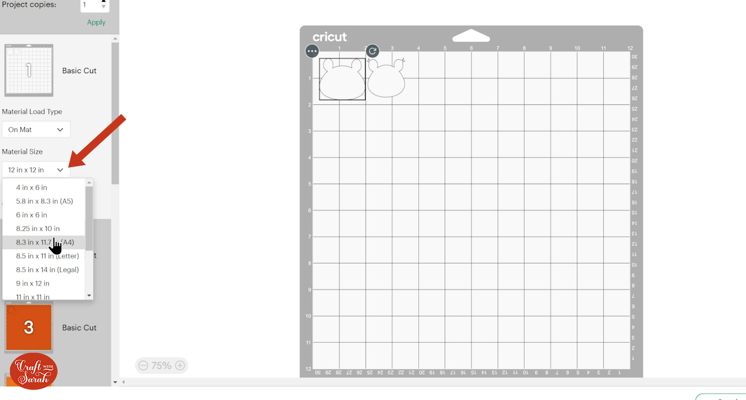 Click the designs on your canvas and use the width/height boxes near the top of the screen to make them the size that you want to cut them.