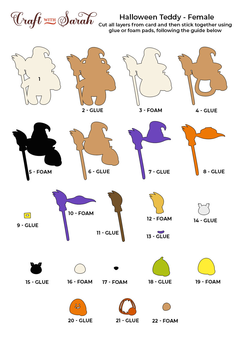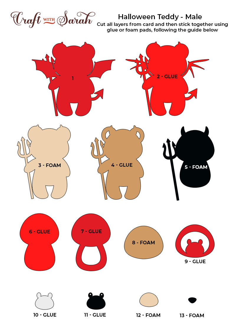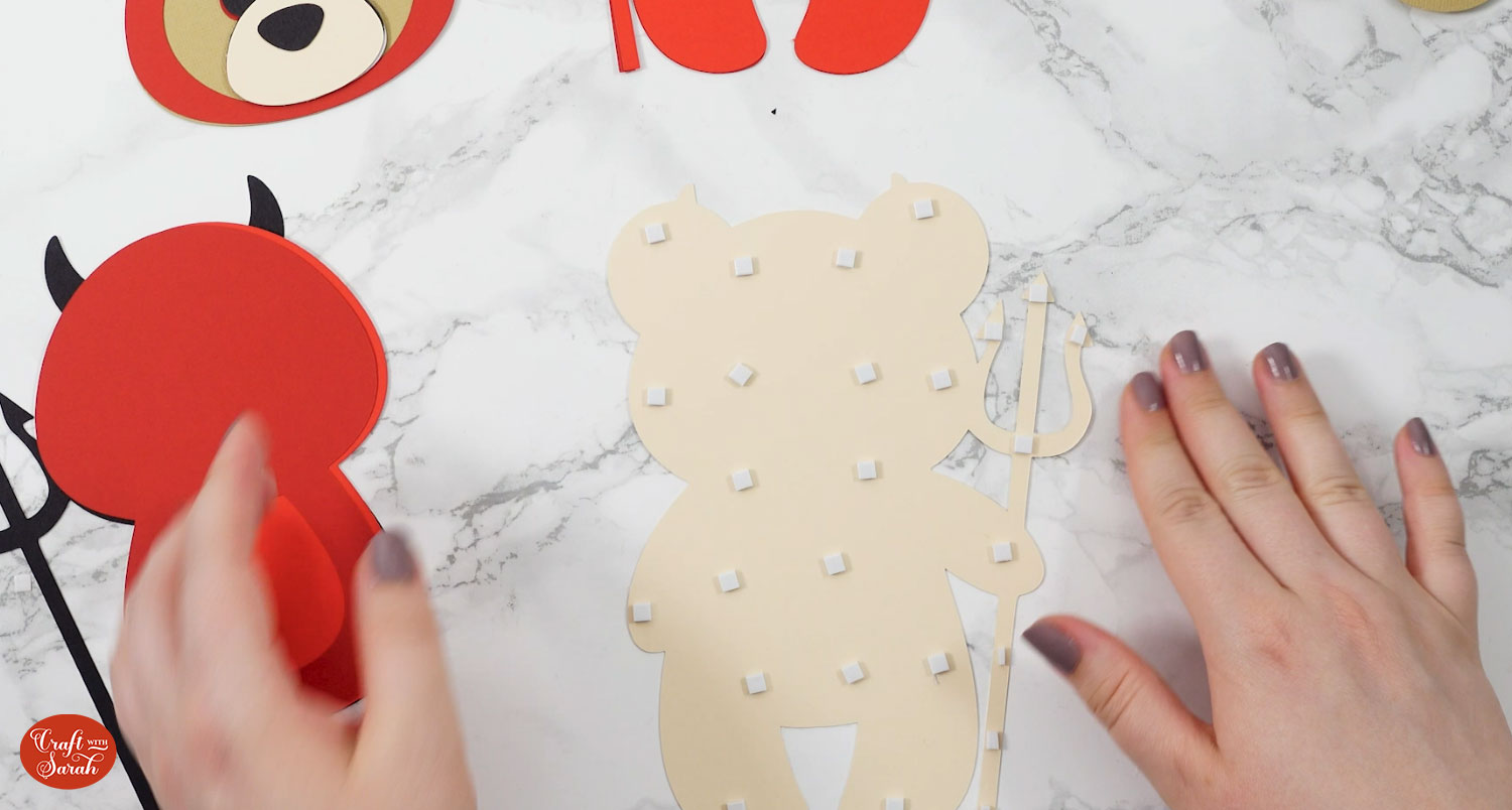 Continue sticking the pieces together, following the assembly guides, until your Halloween teddy bears are all finished.