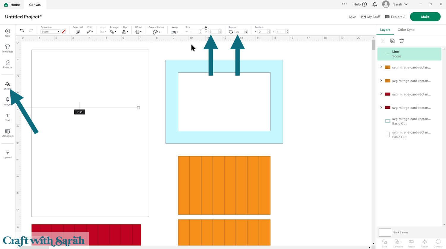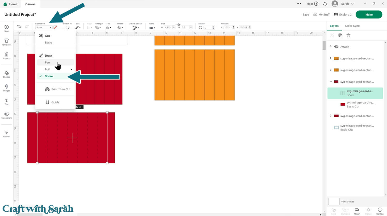 Select the score line and the base card and click Align > Center to put the score line in the middle of the card.