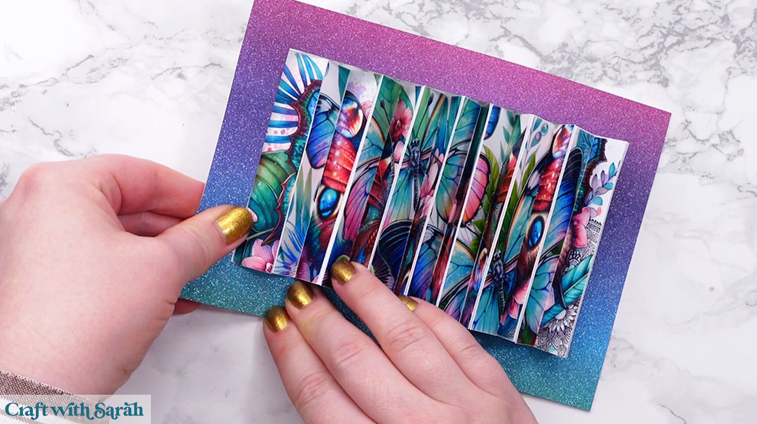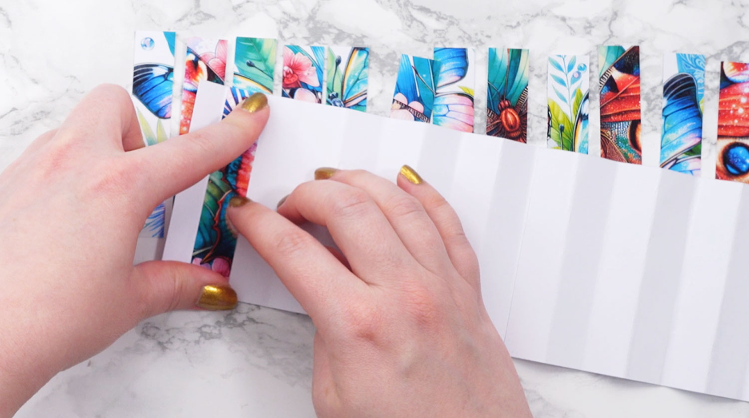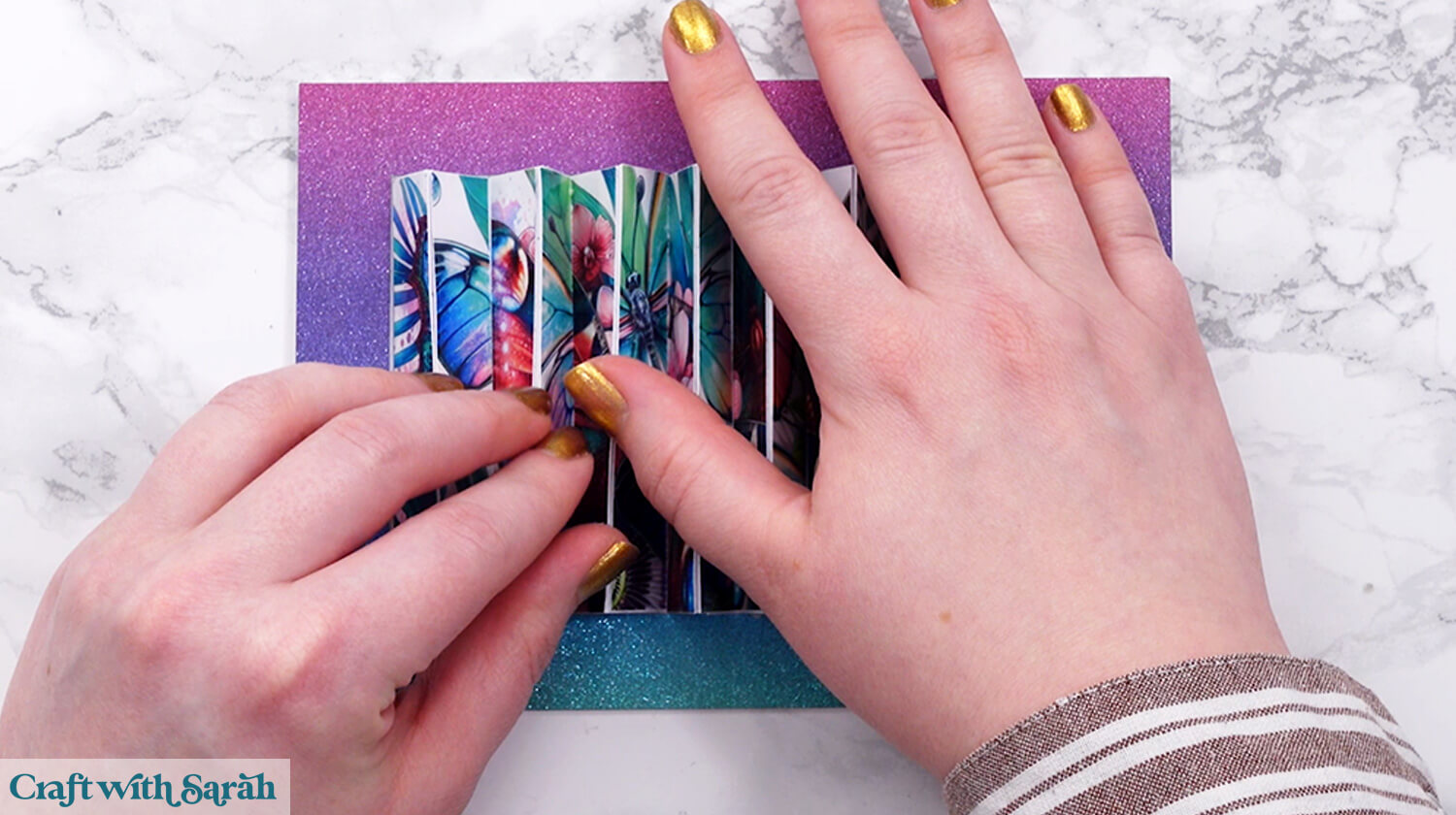The very end tabs on the left and right side of the concertina piece are how it will get attached to your base card, so don’t stick any graphics pieces to those.