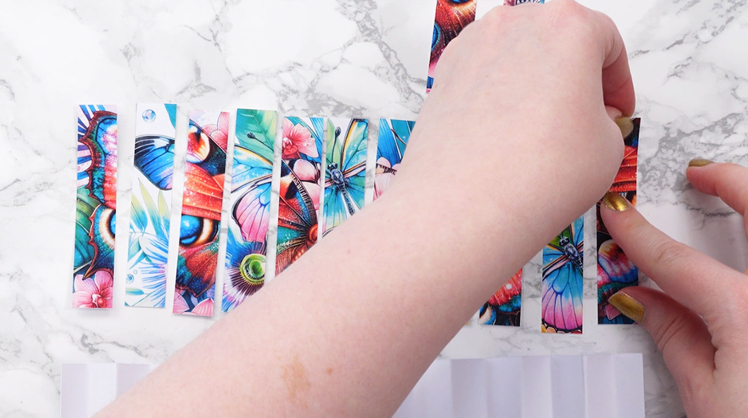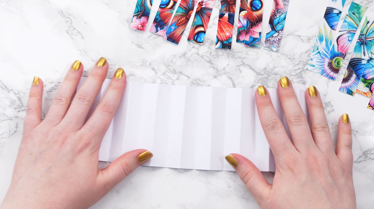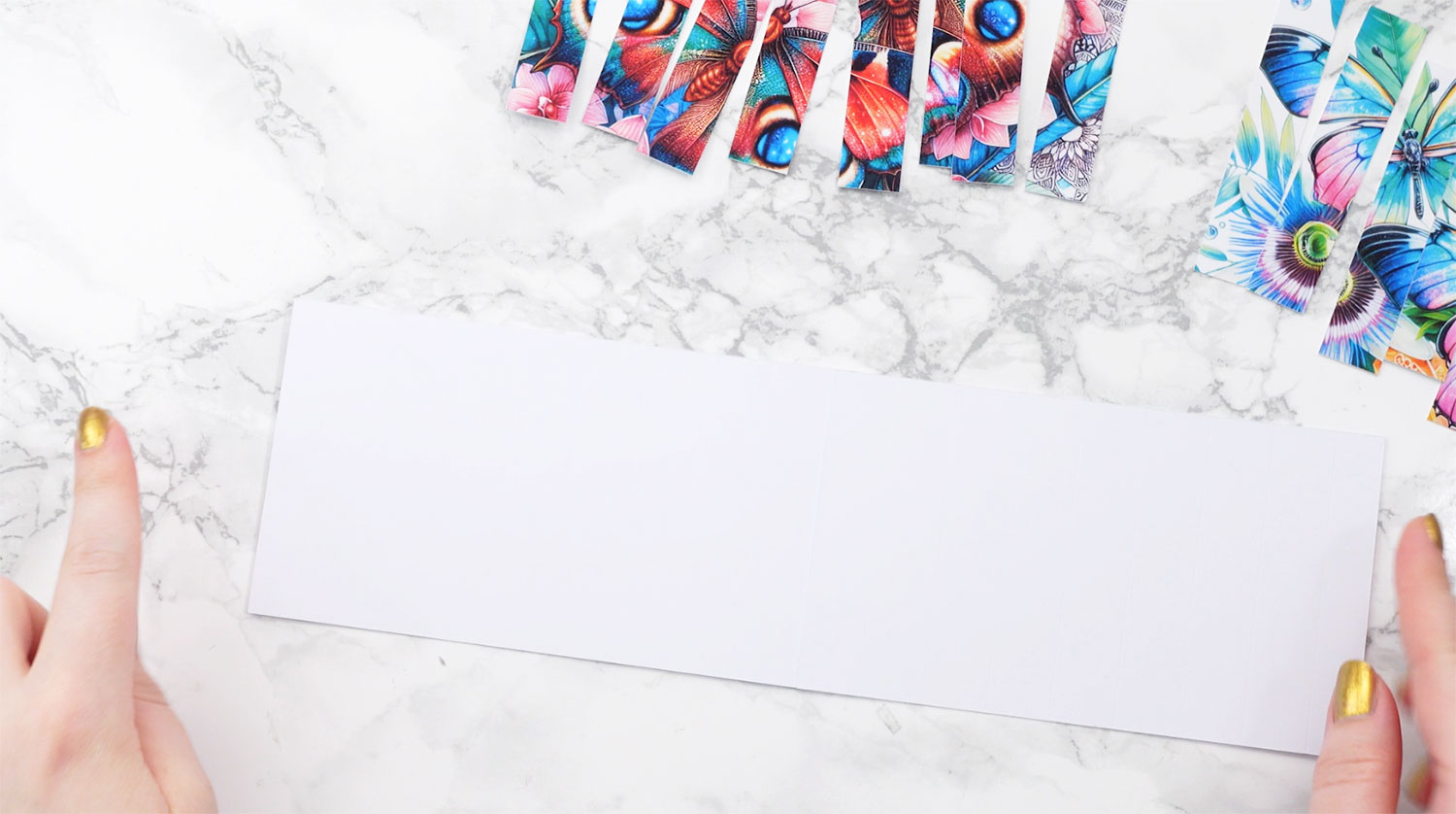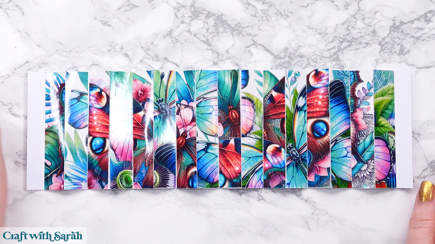 The very end tabs on the left and right side of the concertina piece are how it will get attached to your base card, so don’t stick any graphics pieces to those.