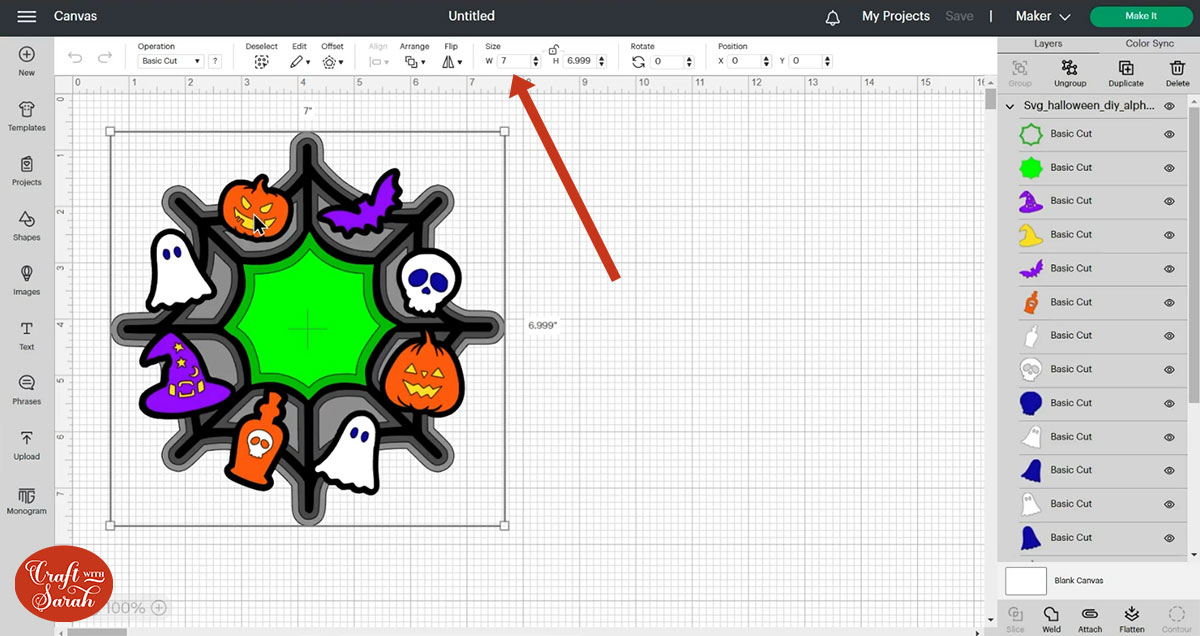 Click the design on your canvas and use the width/height boxes near the top of the screen to make it the size that you want to cut it.