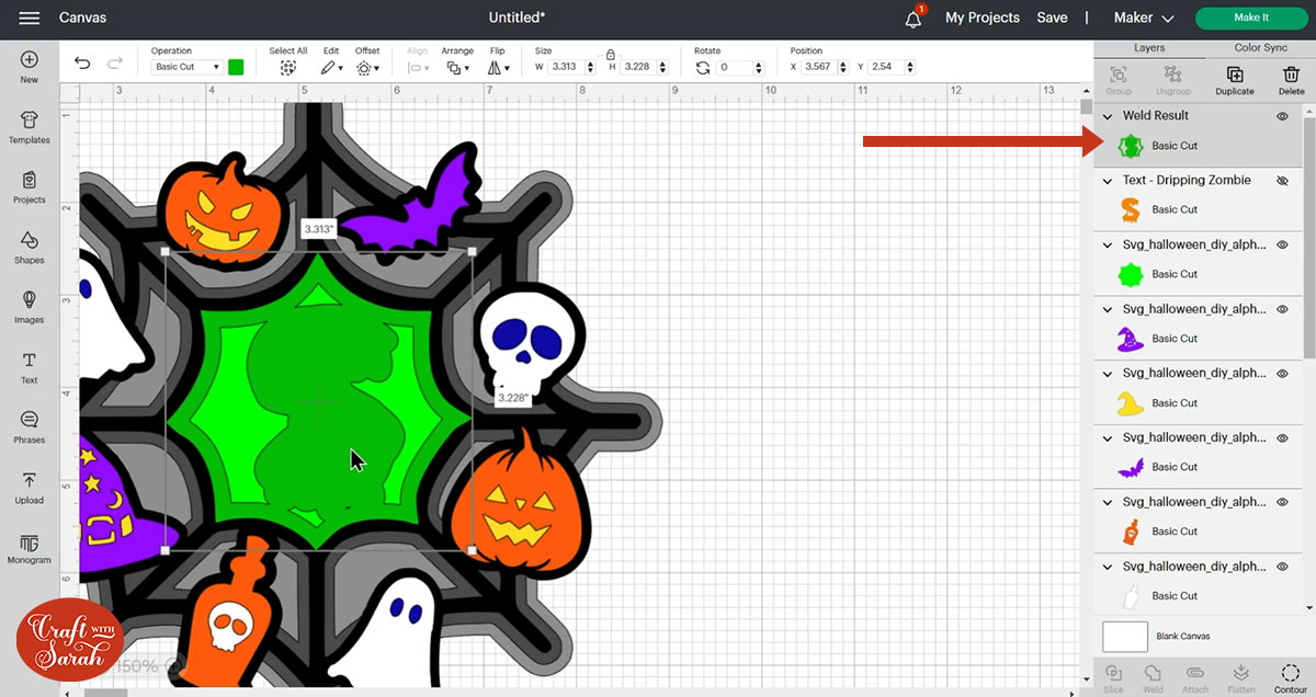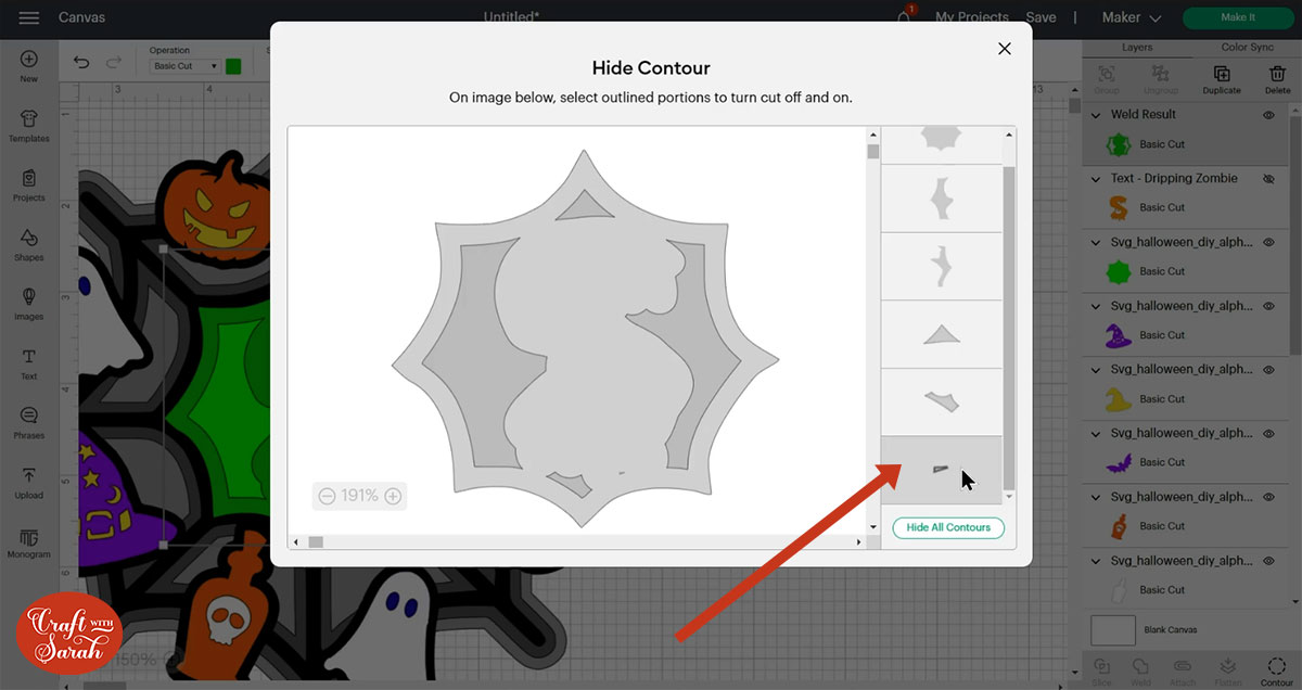 If there are any small areas left in the layer that your Cricut would struggle to cut, use “Contour” to hide them.