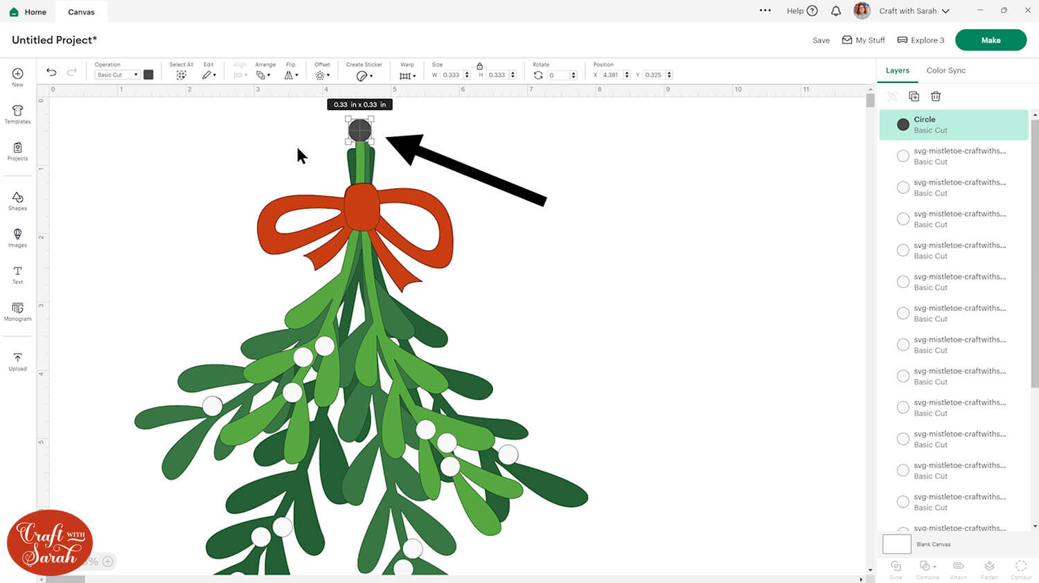 Position the circle on top of the mistletoe so that it is slightly touching the green stems.