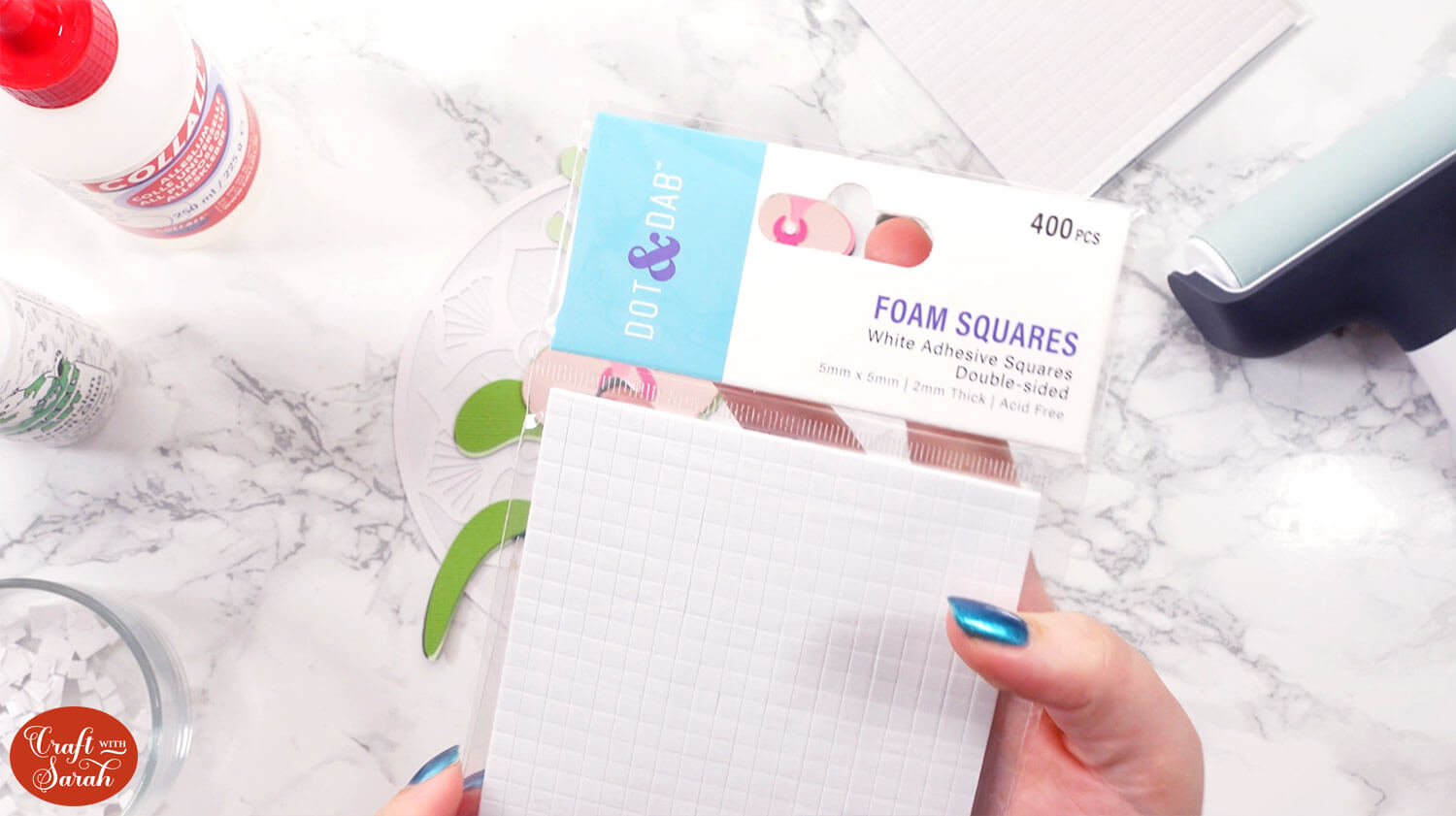 The foam pads that I use are from “Dot & Dab”, but any foam squares will work. If yours are big then you may need to cut them smaller with scissors to fit inside the edges of the layers.