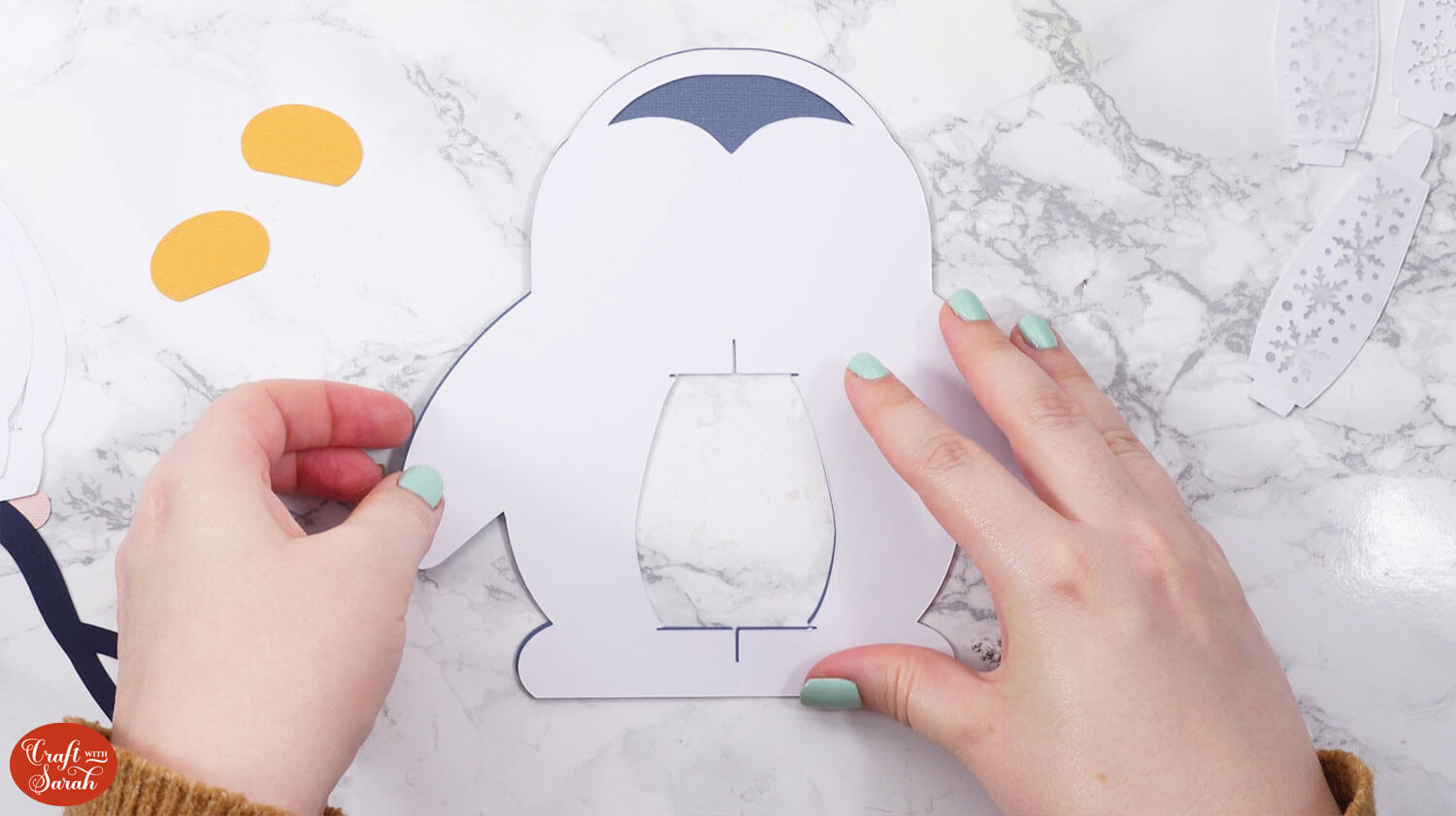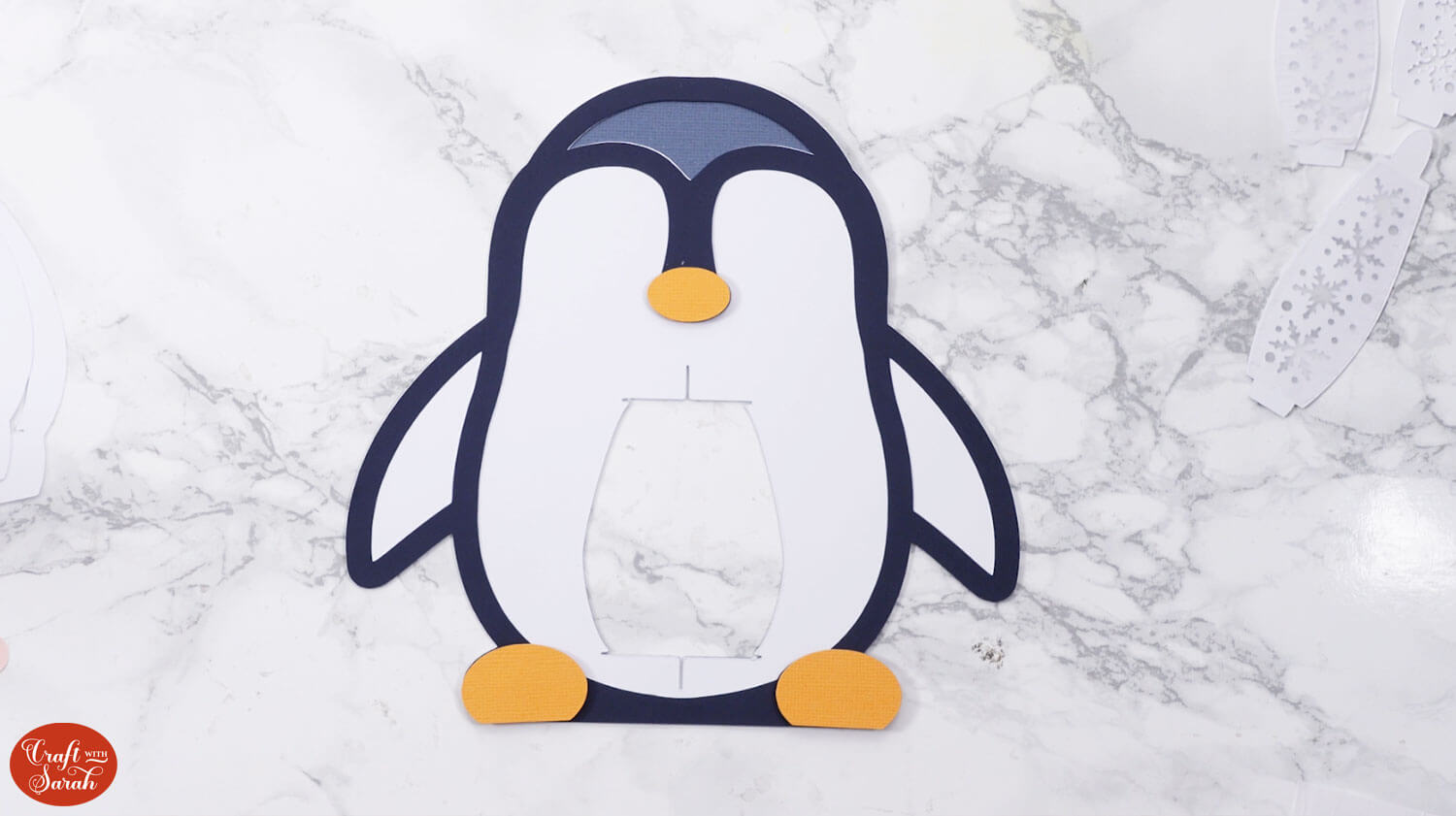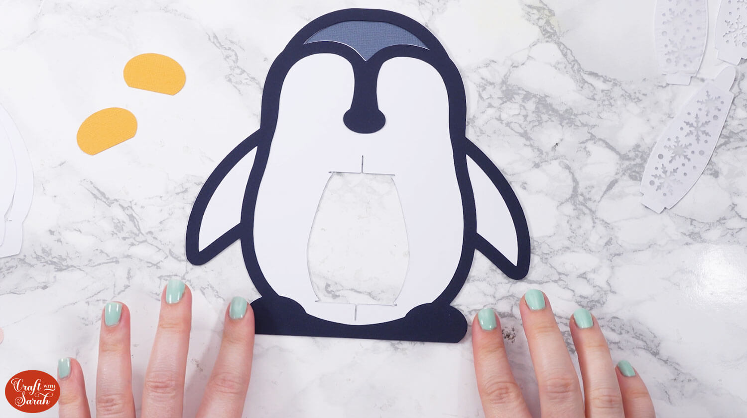 Take the layers that make up the pieces of the penguin and use a combination of glue and foam squares to stick the pieces together.