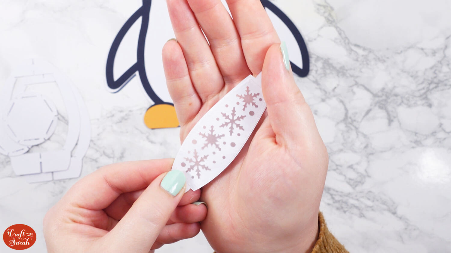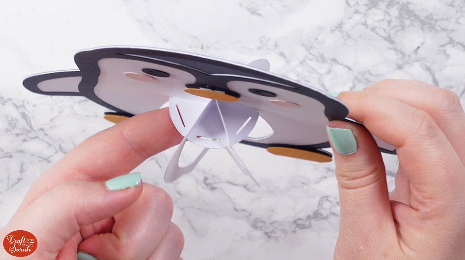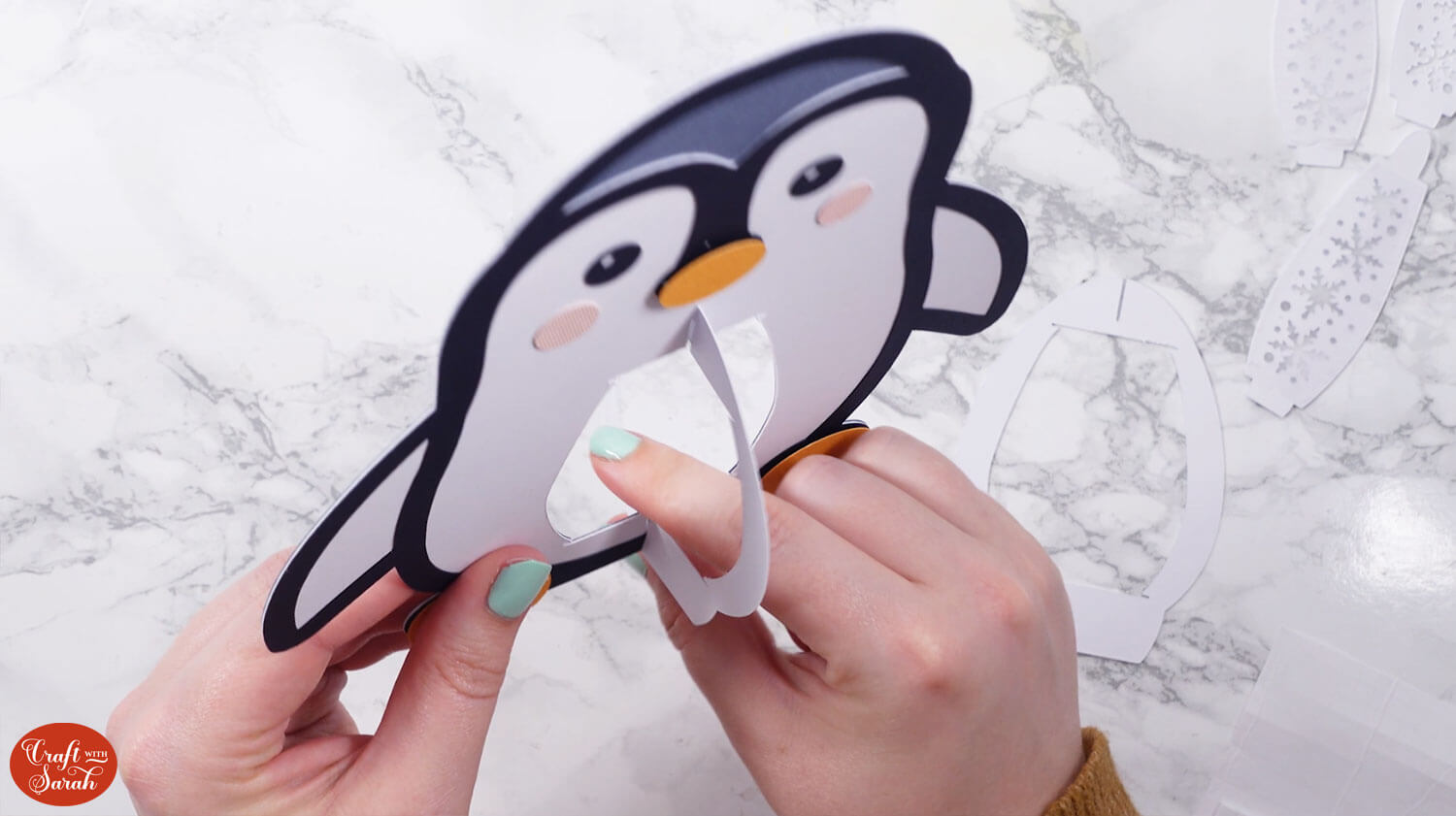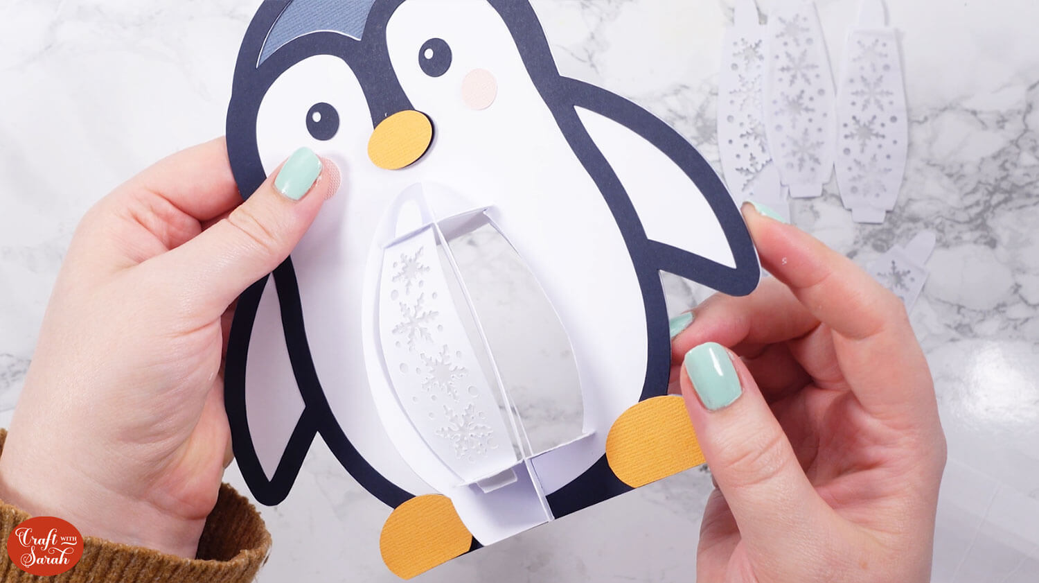 Take the layers that make up the pieces of the penguin and use a combination of glue and foam squares to stick the pieces together.