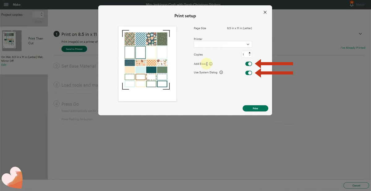 Click the printer drop down and select your printer. You may want to turn on Add Bleed to add a little bit of extra colour around the edge of each sticker. This means that if the Cricut cuts slightly off-centre, you will still see colour on the edges of your stickers.