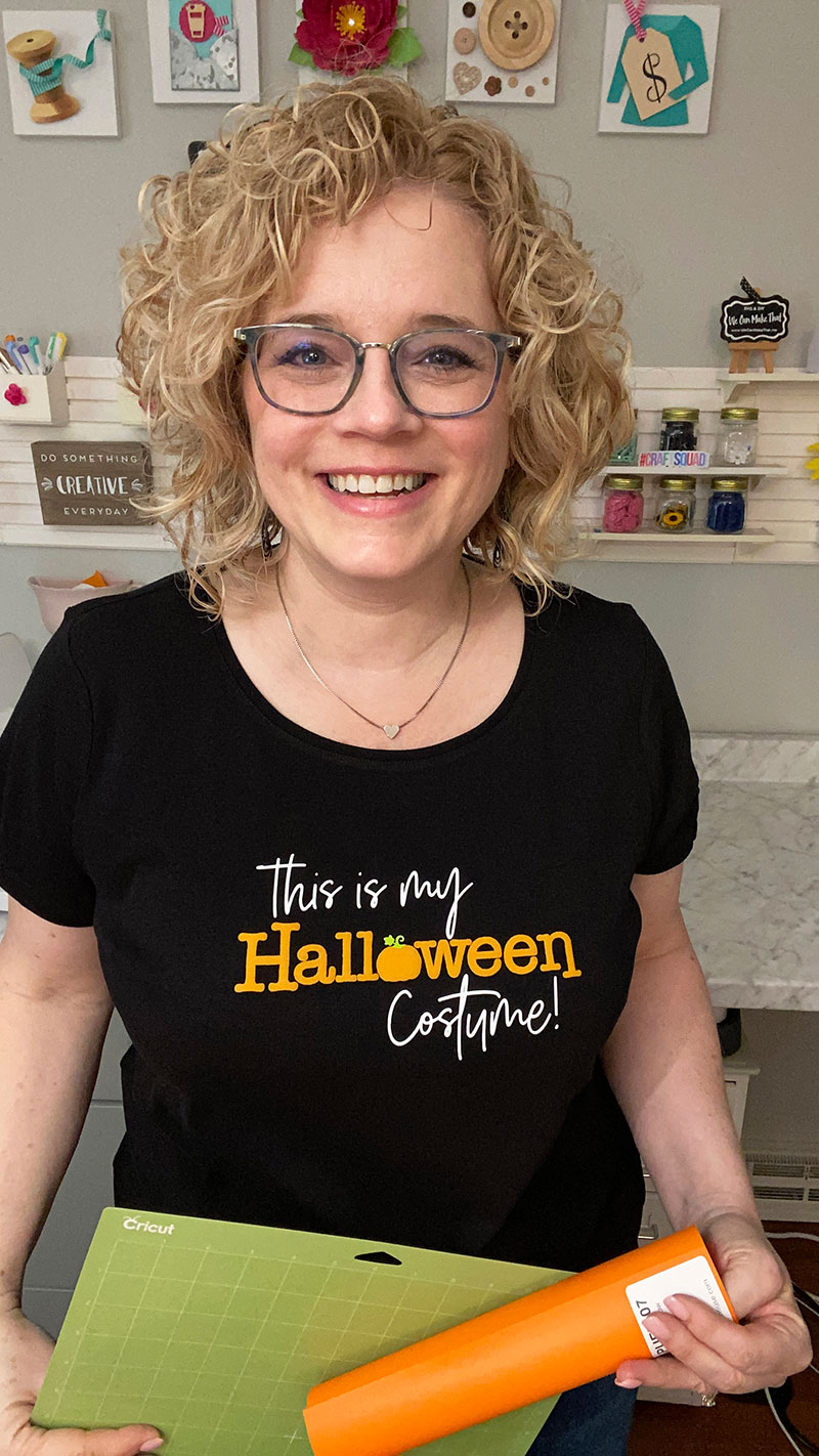 I hope you enjoyed this short and sweet tutorial on how to use heat transfer to make a last-minute Halloween costume idea with your Cricut.