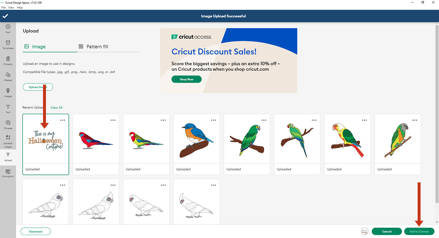 After uploading, it will appear in your recent uploads. Click it to get the green border, then press “Add to Canvas”.
