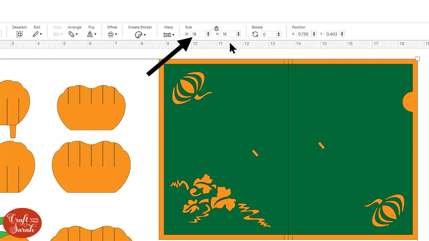 The design should load in at 18 inches wide and 16 inches tall which will make a 5×7 inch card when everything is finished.