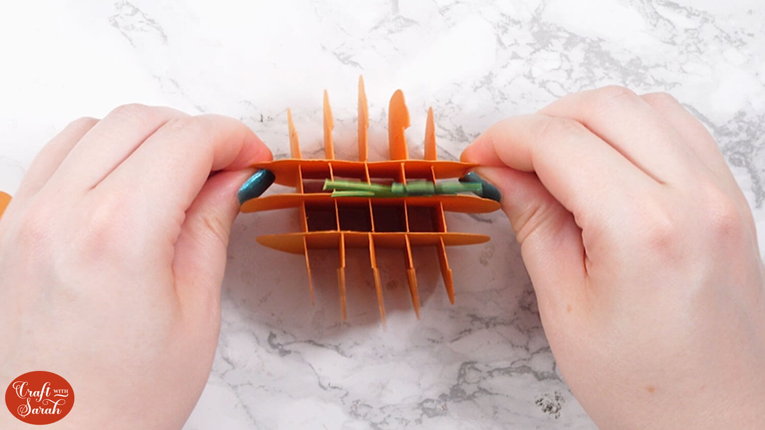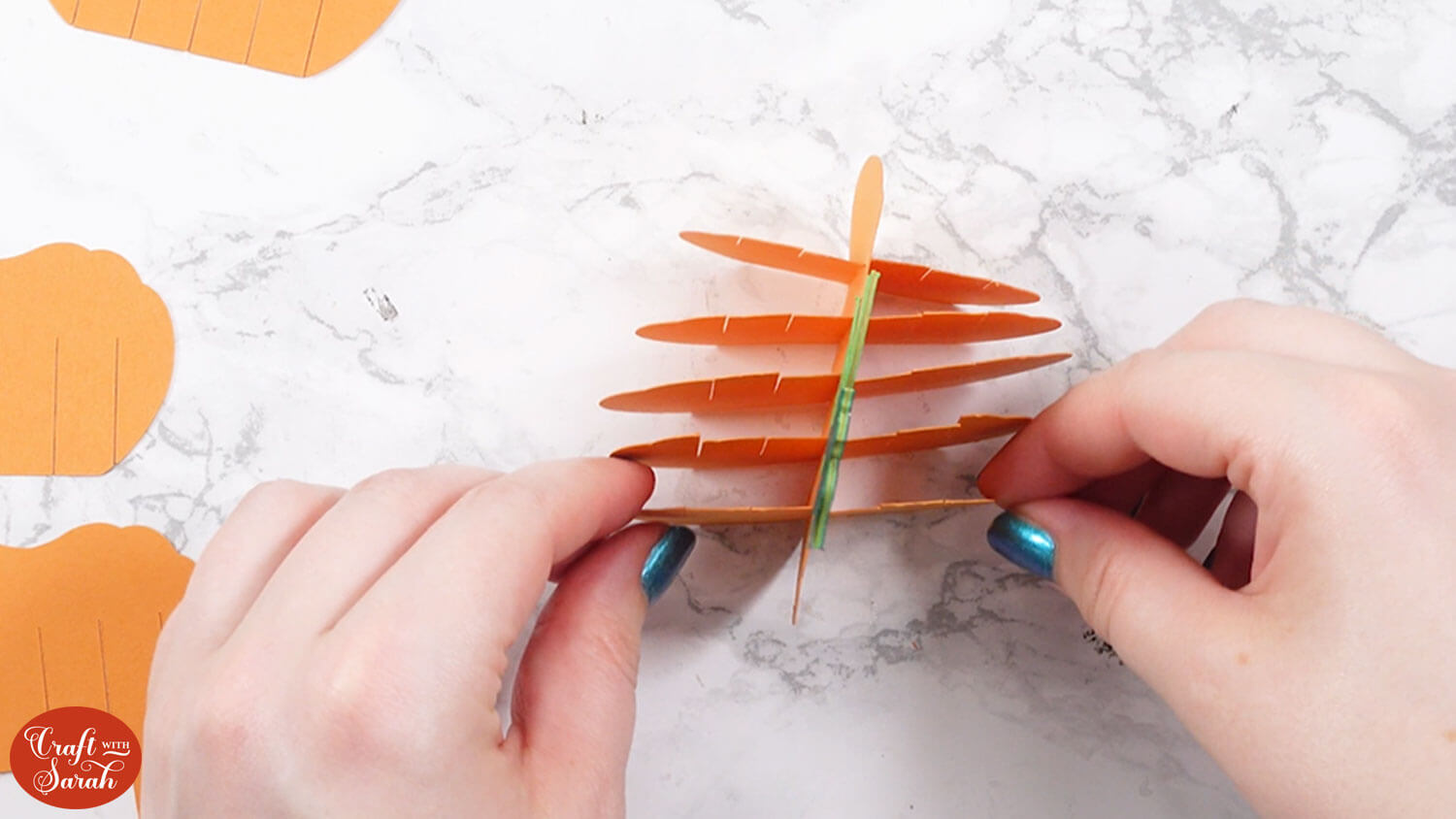 Select the next sized pumpkins and slot one in each side of the existing pumpkin shapes. These will go in the last remaining slits of the original pumpkin/leaf piece.