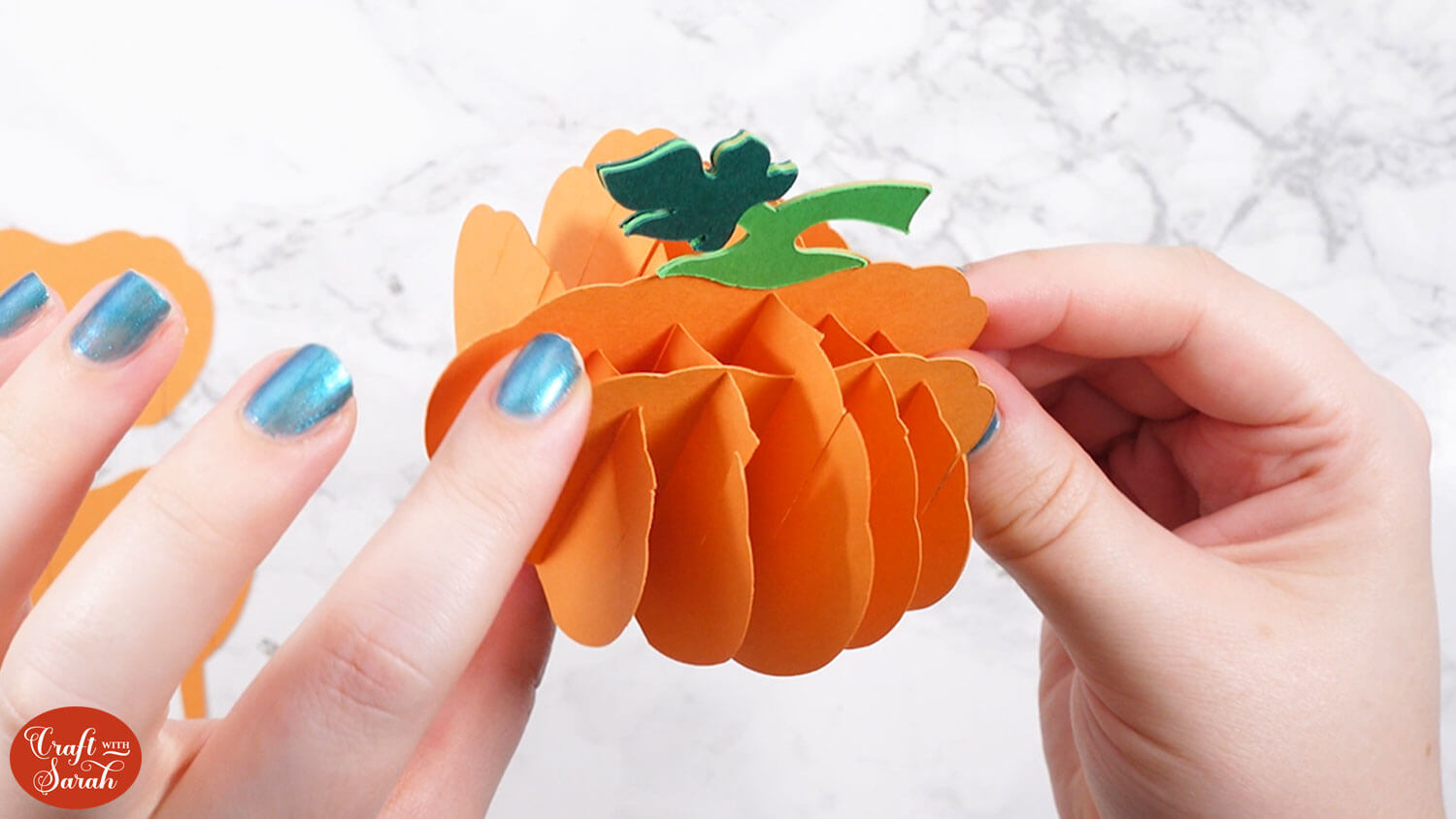 First, glue the leaf pieces to the front and back of the middle pumpkin piece.