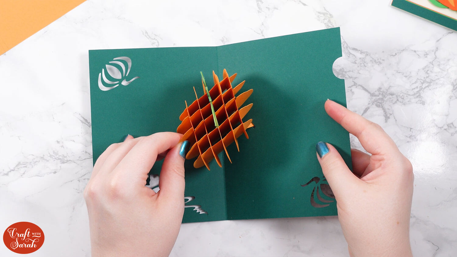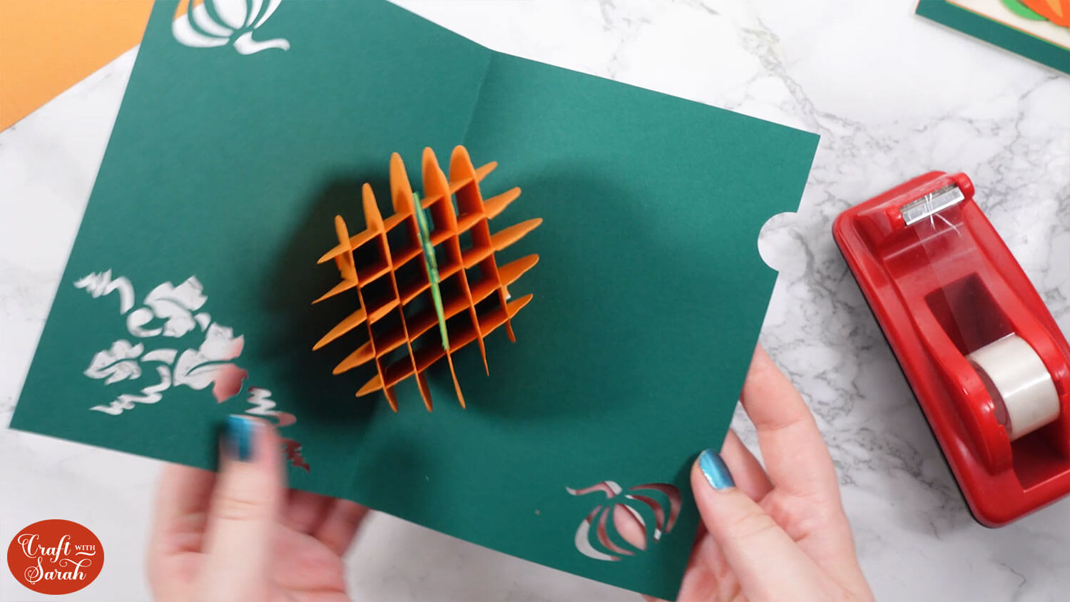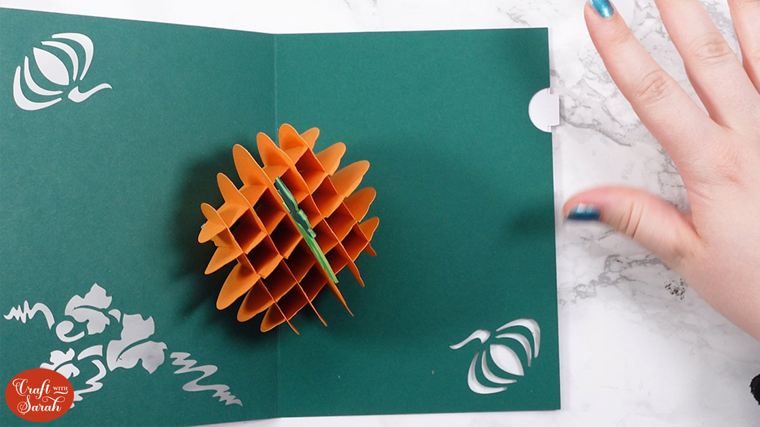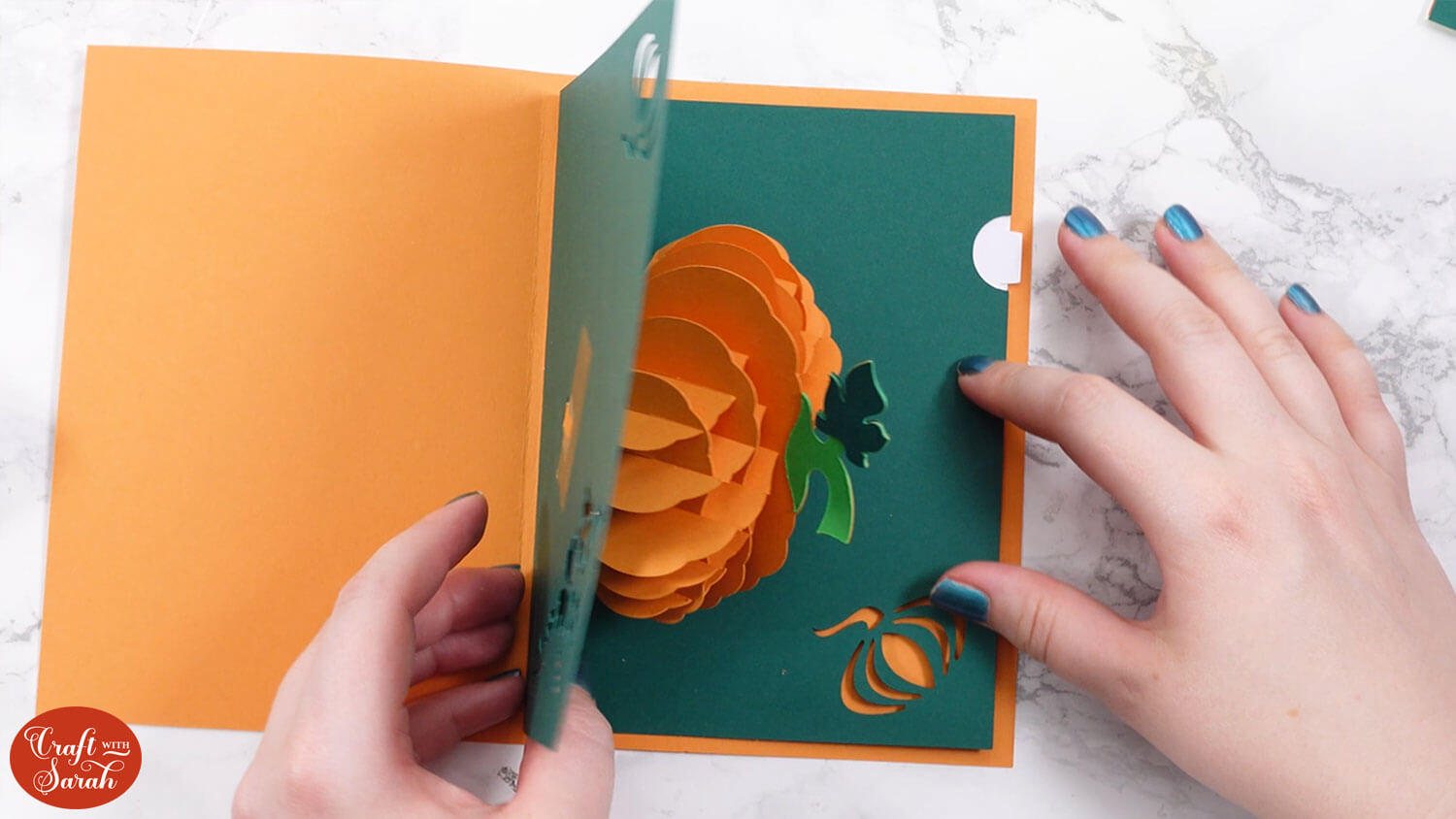 The card opens to show a slot-together pop up pumpkin and there’s a hidden pull-out message panel so that you have space to write your message.