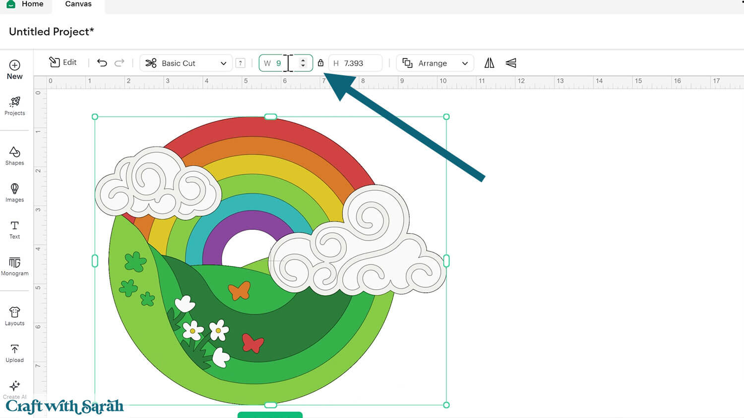 I cut my rainbow at the size the SVG loaded in at, which is 7 inches wide and 5.75 inches tall.