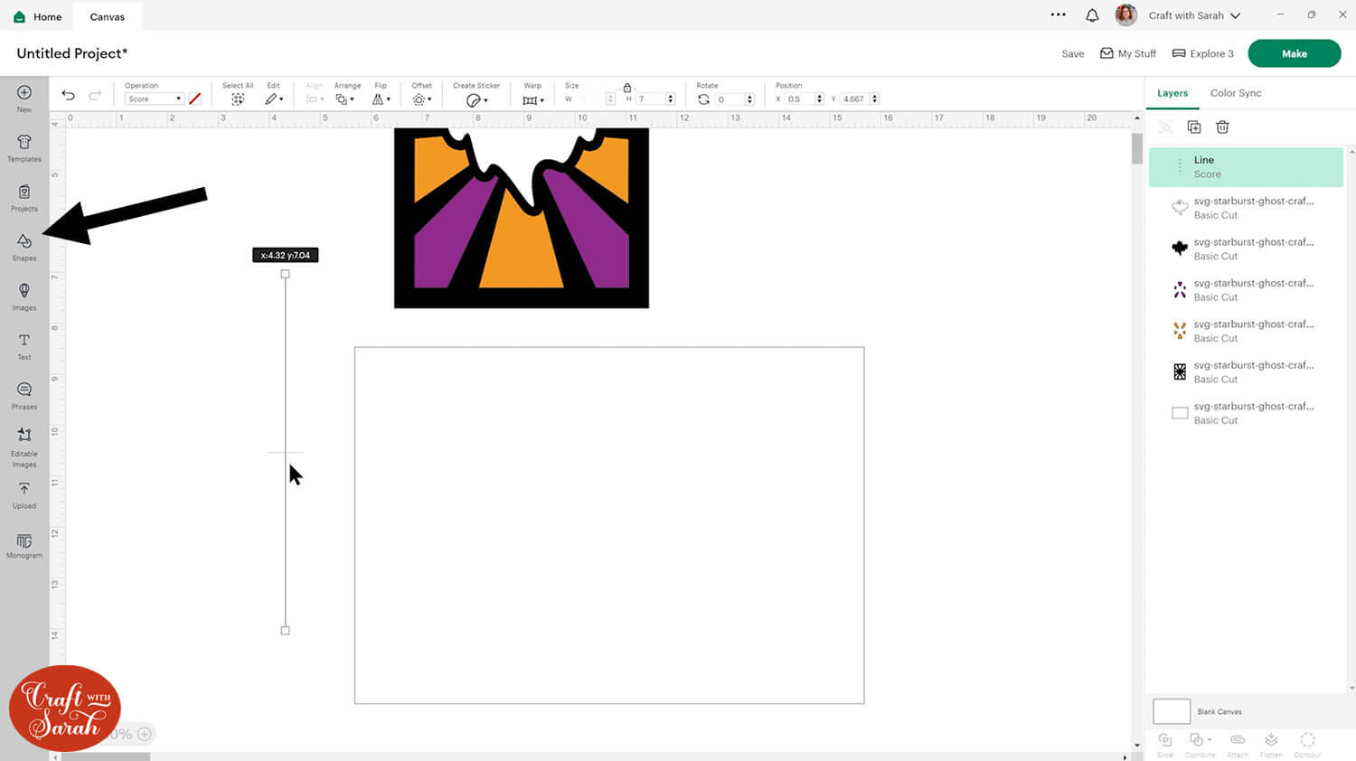Click “Shapes” and insert a Score Line. Make it 7 inches tall.